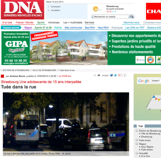 Une jeune femme de 19 ans est décédée lundi soir, après avoir été poignardée plusieurs fois au niveau de la gorge, à proximité du 14 rue de Wasselonne, dans le quartier de la gare à Strasbourg. C’est ce que l’on apprend dans les DNA ce matin. Une adolescente de 15 ans, soupçonnée du meurtre, est actuellement en garde à vue et l’enquête confiée au parquet des mineurs. Les deux jeunes filles habiteraient dans le quartier selon des témoins.
