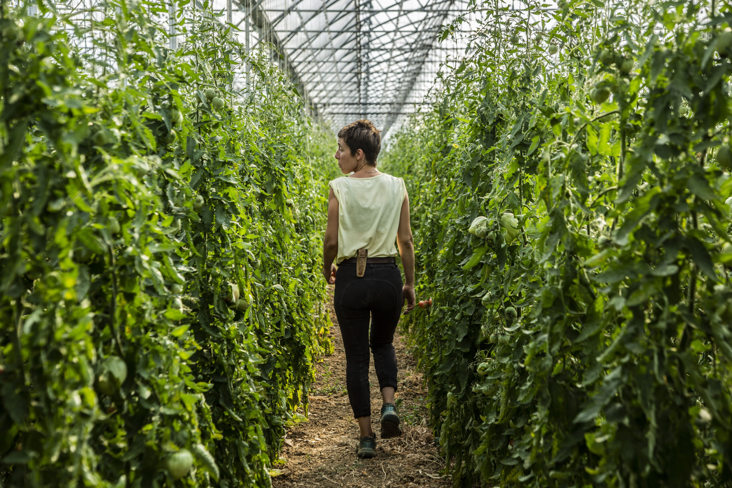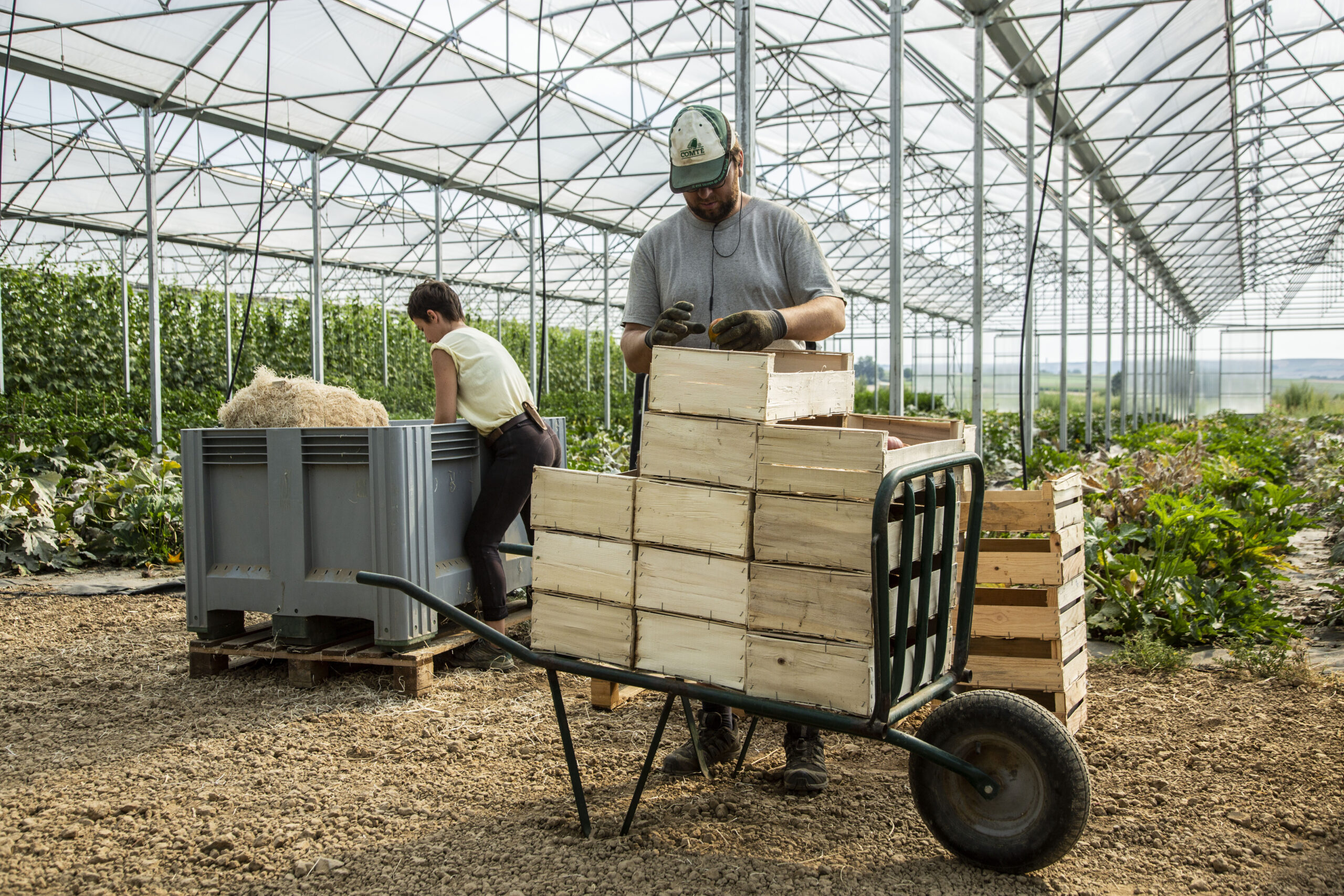 En plus de la gérante, l’équipe de la journée est composée de deux employés permanents et de quatre saisonniers, mobilisés pour les récoltes d’été. La saison chaude est une période de grosse activité, impossible de ne pas travailler, au contraire. L’objectif de la journée est de cueillir près d’une tonne de tomates prêtes à la vente. Les palettes seront ensuite envoyées à des grossistes ou mises sur les étals de la boutique de vente directe de la ferme Les Jardins Gourmands.