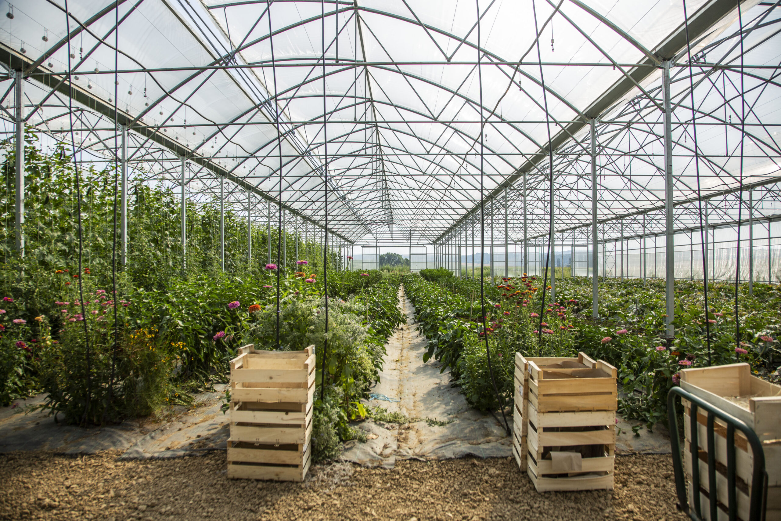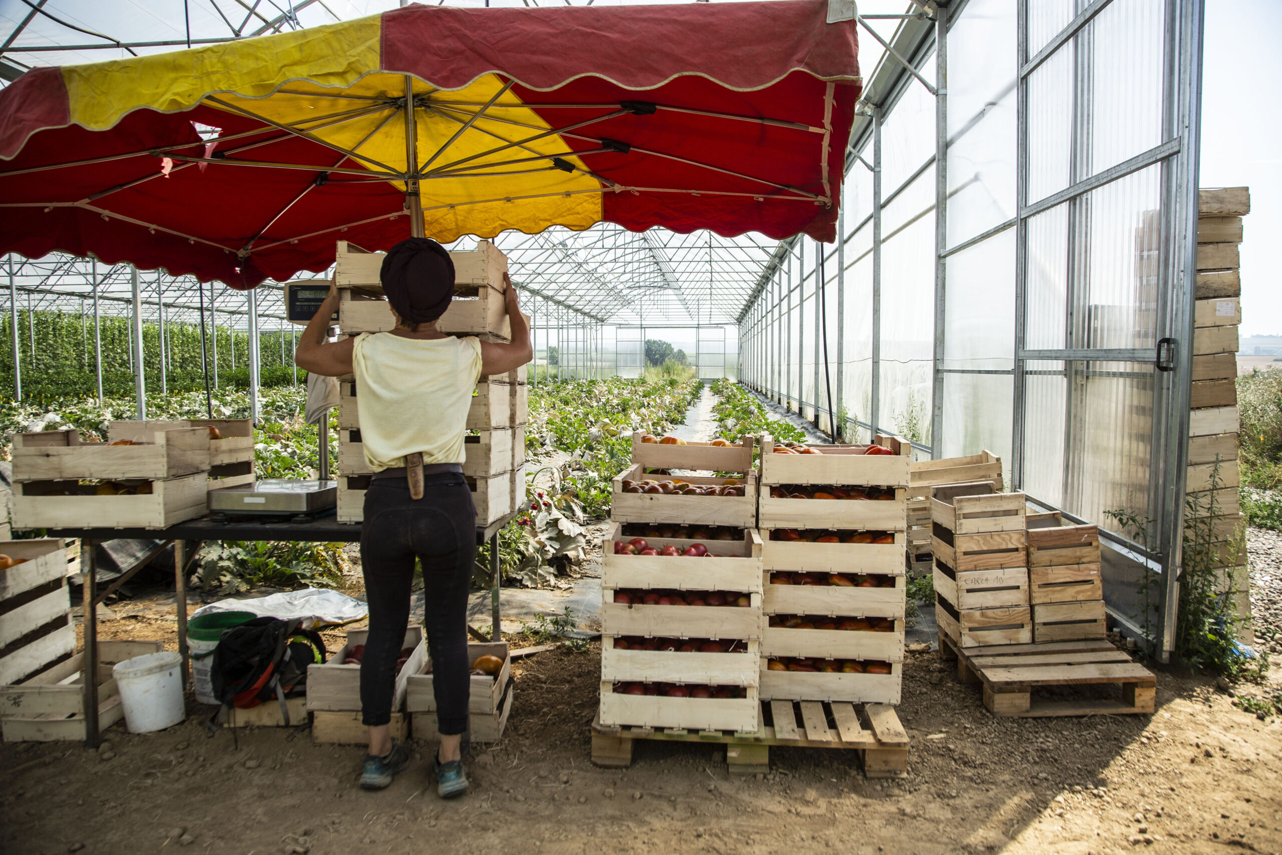 Les travailleurs agricoles font partie des professionnels les plus exposés au phénomène de « stress thermique », selon une étude de l’Organisation internationale du travail de 2019. Il s’agit d’une chaleur corporelle excessive qui peut provoquer des symptômes comme des vertiges, des maux de tête, une sensation d’épuisement, une démarche titubante, voire la mort. Derrière le hangar de la ferme, plus loin sur la colline, se dresse une grande serre où poussent une vingtaine de variétés de tomates, des concombres, des poivrons et des courgettes. Le soleil tape sur la grande bâche en plastique.