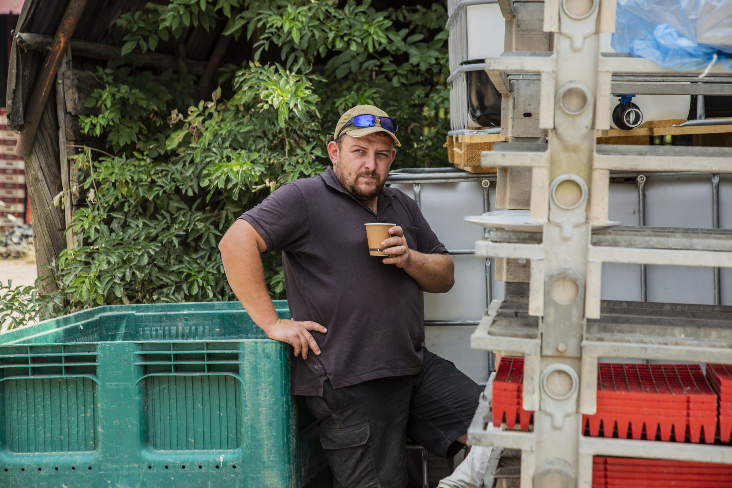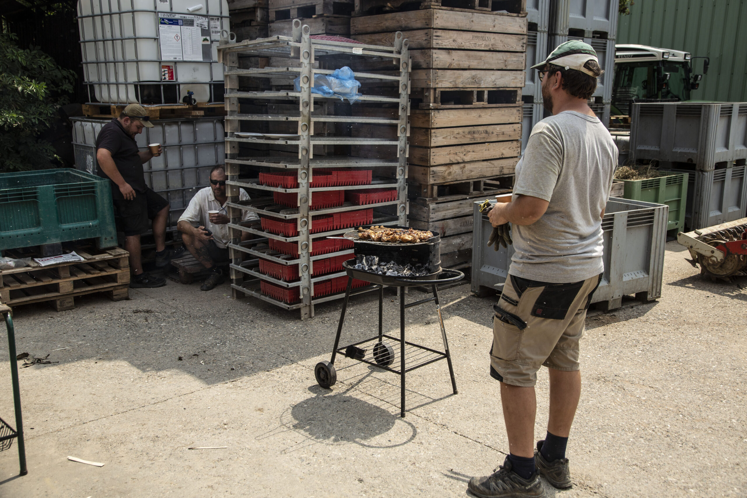 Le rythme de travail baisse un peu, et les trois employés s’arrêtent pour discuter autour des palettes. Ce qui inquiète plus Stéphane que la chaleur, c’est la perte d’attractivité du métier d’ouvrier agricole : « On a de plus en plus de mal à trouver des gens, qui ont peut-être autre chose à faire que de travailler dehors sous 30 degrés. L’agriculture est mal payée. » Les ouvriers agricoles sont payés au SMIC en général.