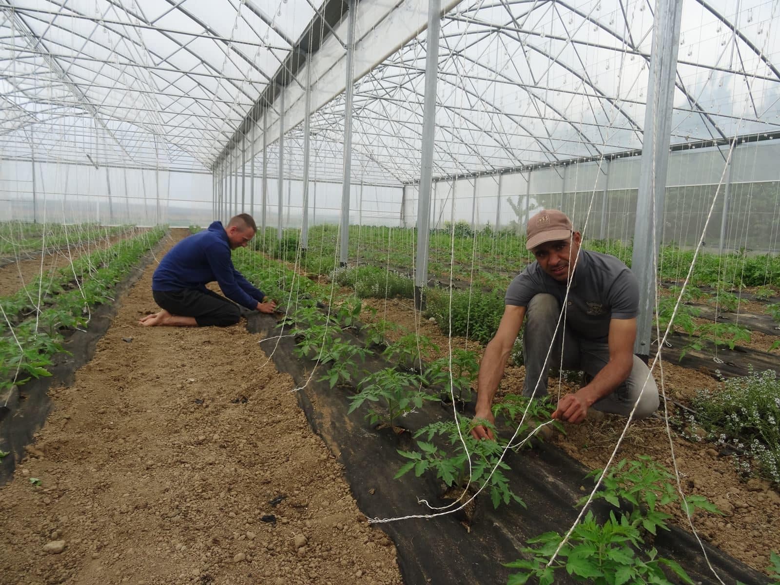 Dans la serre, Boukthir et Robin, deux employés de la ferme et spécialistes des tomates, discutent passionnément des techniques de cultures qu’ils peuvent utiliser tout en accrochant les plants à des fils tuteurs :