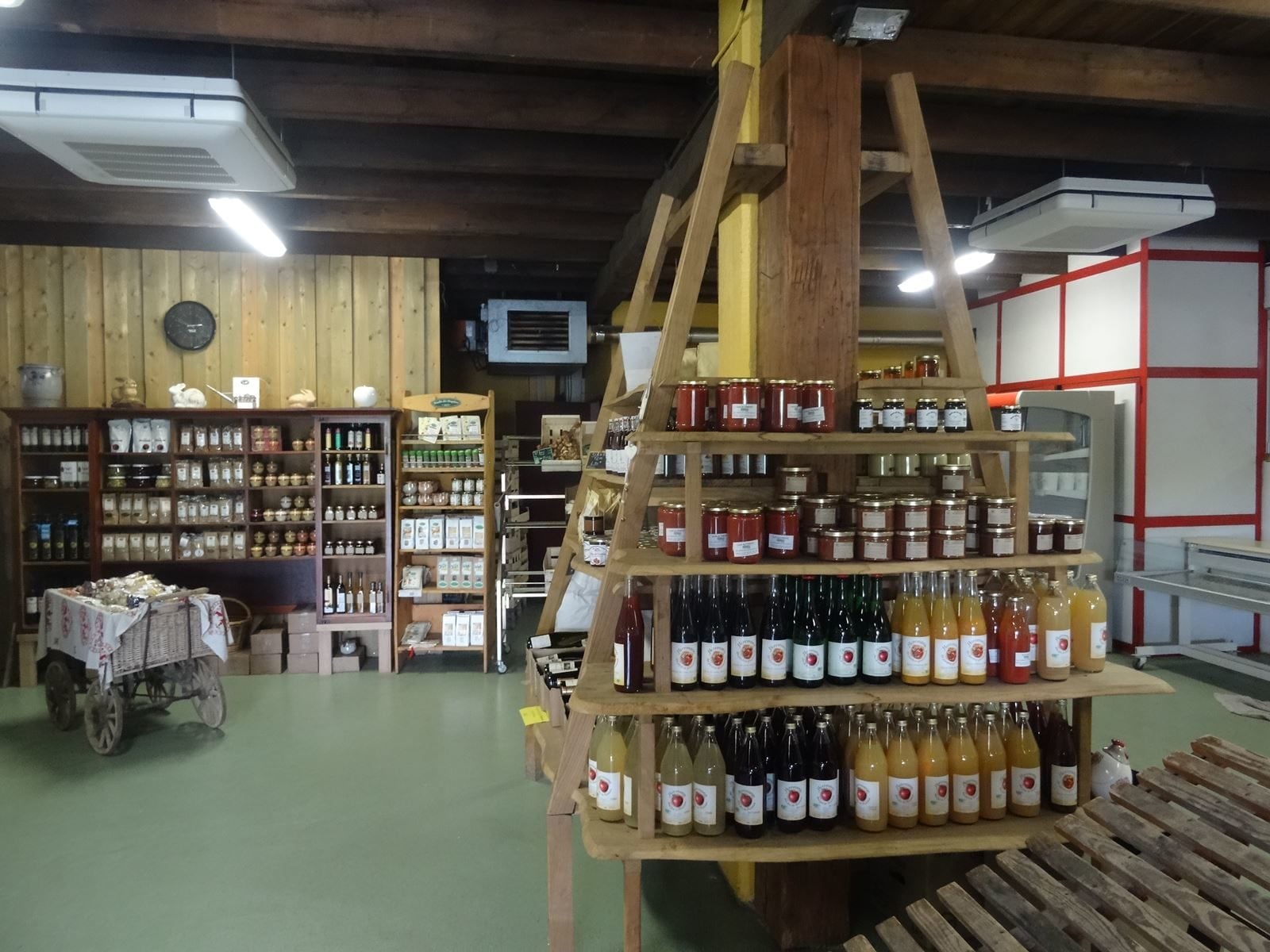Sur une étagère, dans la ferme, de nombreuses bouteilles de jus de fruits sont entreposées. Une partie des fruits est transformée en jus dans un pressoir artisanal situé dans un village non loin de là, à Dossenheim-sur-Zinsel. Ces boissons font partie intégrante de l’identité de la ferme. Ils sont vendus dans le magasin de Bouxwiller mais aussi sur les marchés.