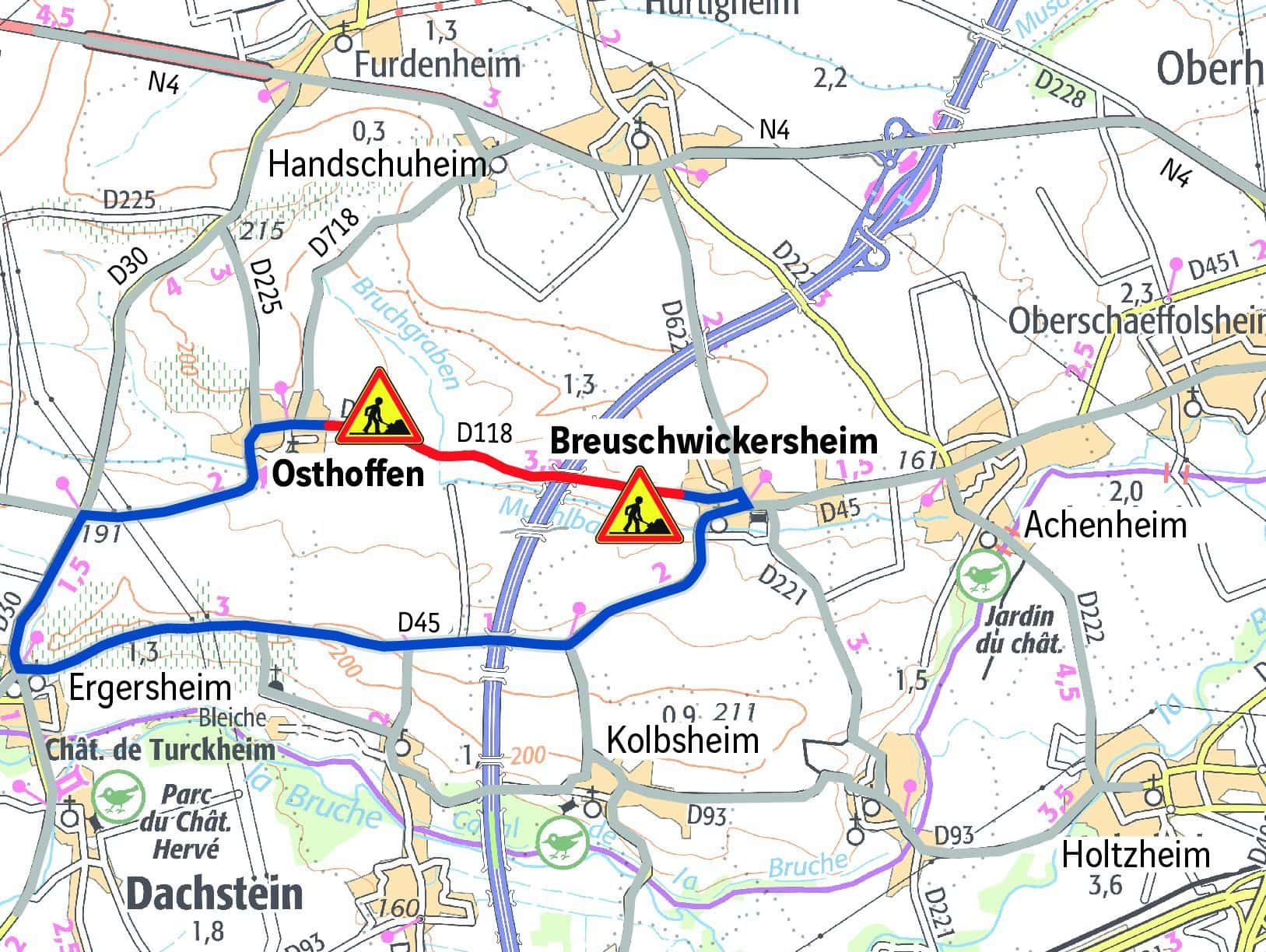 Troisième chantier, cette fois pour réaliser l’enjambement du GCO par la RD118 entre Osthoffen et Breuschwickersheim, avec une fermeture programmée du lundi 8 au mardi 30 avril. La déviation de la circulation passe par Ergersheim (voir ci-dessous).