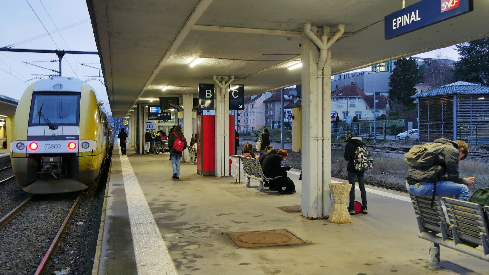 En début d’après-midi à Épinal, il faut attendre plusieurs heures pour prendre le train vers Saint-Dié-des-Vosges. Le magasin Monoprix dispose de quelques tables où des lycéens tuent le temps. Quelques hommes boivent une canette de bières ou une toute petite bouteille de vin rouge. Deux pigeons font des allers-retours réguliers entre le hall et l’enseigne. 16h42 : le TER démarre. Il n’en reste plus que trois avant la fin du service.