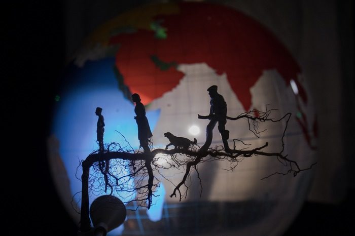 Tout aussi actuelle que celle de la machine, la problématique du déplacement occupera deux spectacles : Terres invisibles, de la Cie Livsmedelt Theater et A de la Cie Skappa ! Terres invisibles met en regard le voyage de Marco Polo, et son récit, avec le traitement médiatique actuel des migrants. L’exil y est raconté à travers un mélange entre le micro- et le macroscopique, où les corps se font paysages pour narrer les déplacements qui concernent aujourd’hui des milliers d’individus. Dans A, nous partons à la recherche du paradis terrestre dans un théâtre d’ombre et de peinture : une visite troublée par un intrus qui viendra détruire petit à petit l’exposition.