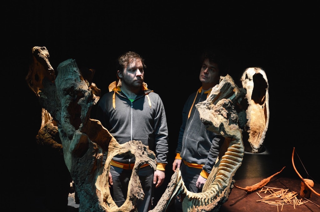 Émergeant alors de l’obscurité et du silence, Benoît Sicat (qui est aussi le metteur en scène) et son acolyte Nicolas Camus avancent vers les spectateurs avec d’étranges instruments de musique, taillés dans le bois brut. Des sons forestiers, craquements de bois et autres cris d’oiseaux, commencent à emplir l’atmosphère sous les yeux attentifs et les oreilles suspendues des petits. C’est une invitation, une étrangeté familière que cet appel de la forêt.