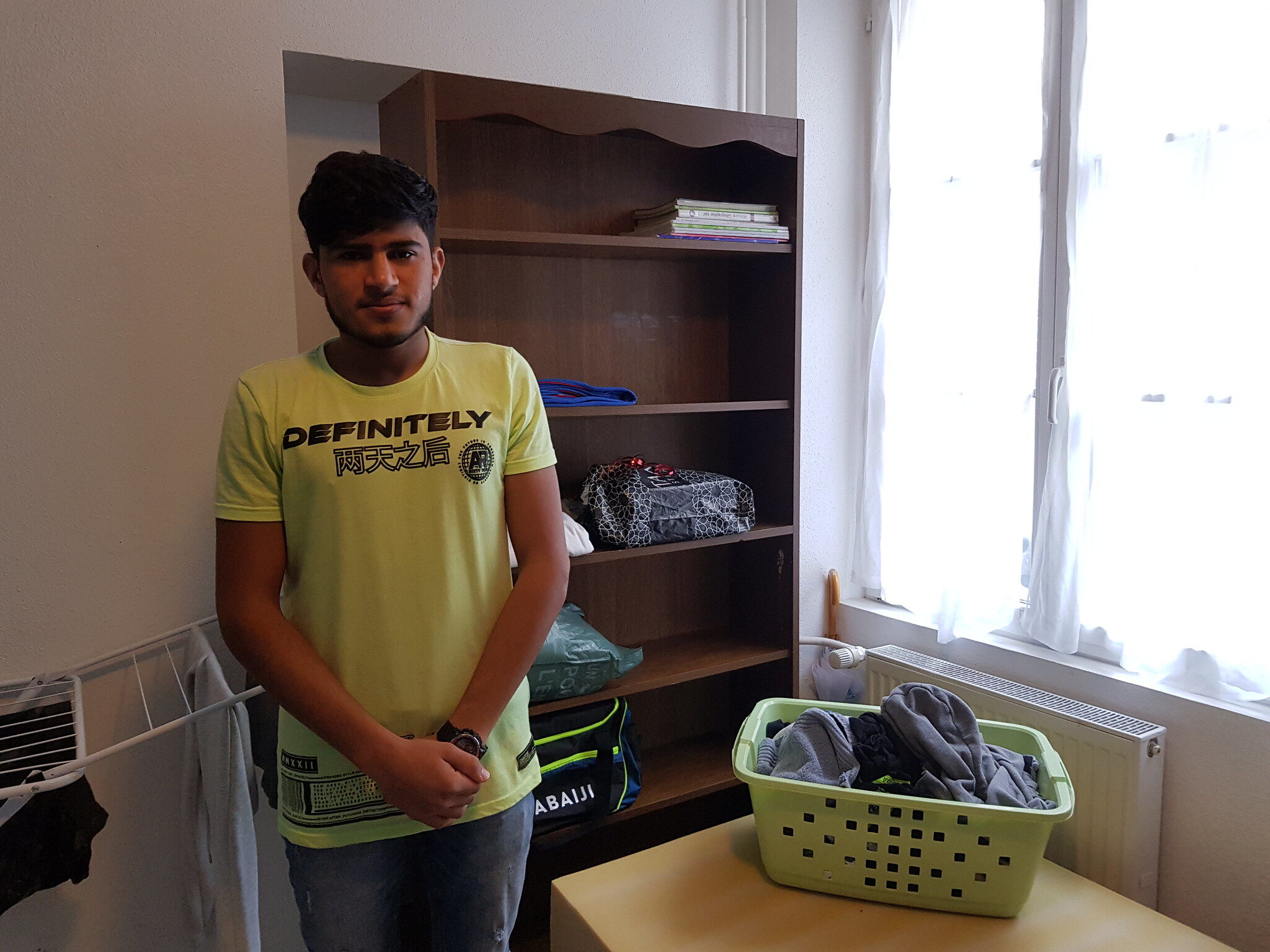 Dans son français hésitant, Mustapha réussit à dire quelques phrases : « Je veux aller dans une famille, pour apprendre à bien parler français. » Et il est prêt à partir vite s’il le faut. Ses étagères sont quasiment vides. Mais en attendant, il vit ici au Foyer Notre-Dame, situé en plein cœur de Strasbourg, avec d’autres migrants mineurs comme lui.
