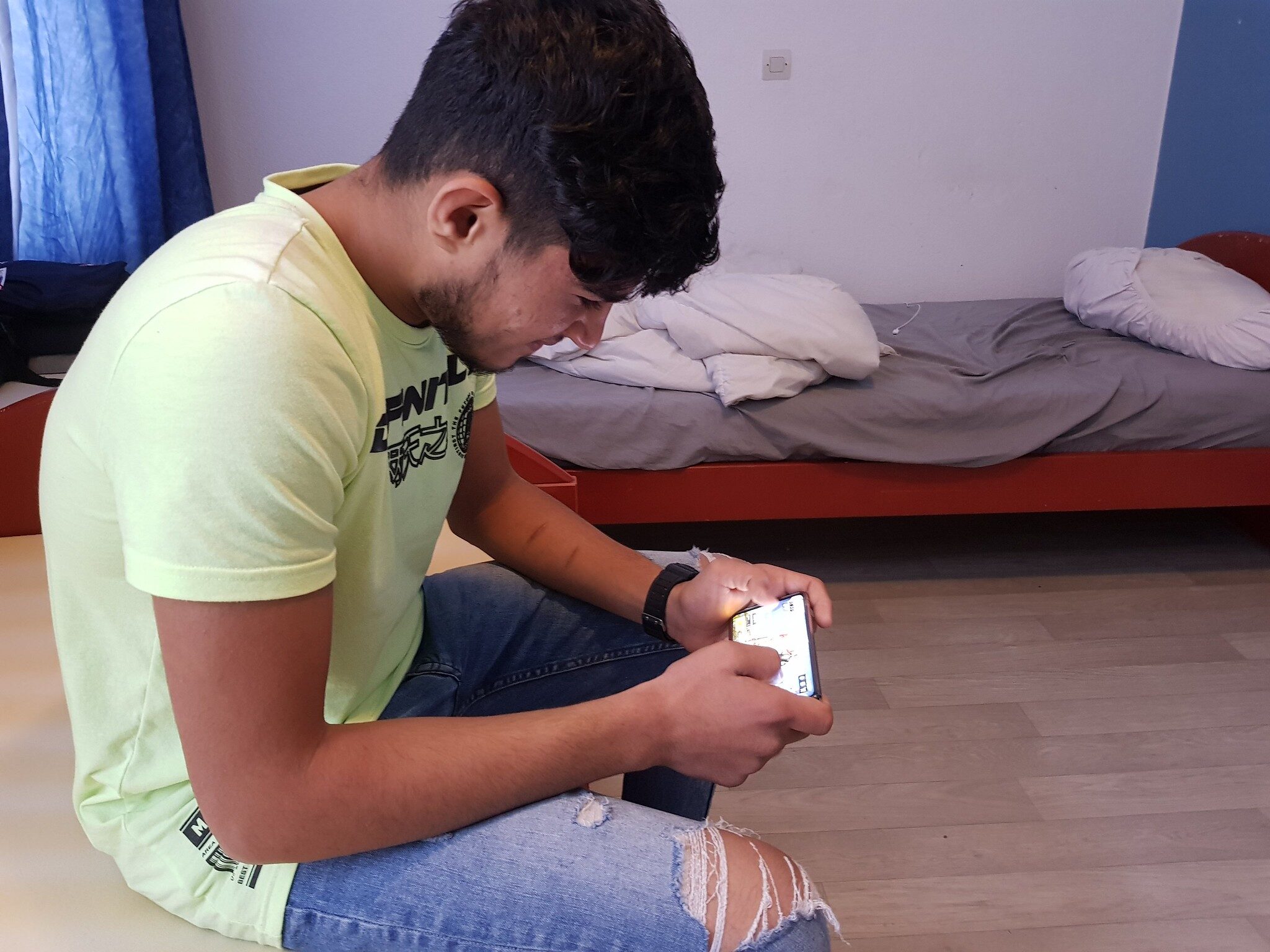 Avec son tee-shirt vert flashy, et un jean déchiré aux genoux, Mustapha ressemble à n’importe quel adolescent. Seules les cicatrices visibles sur son avant-bras gauche font penser à un passé violent. Différent. « Je suis venu seul, en marchant et en voiture », explique le jeune homme, son téléphone dans les mains avec le jeu-vidéo mis sur pause.