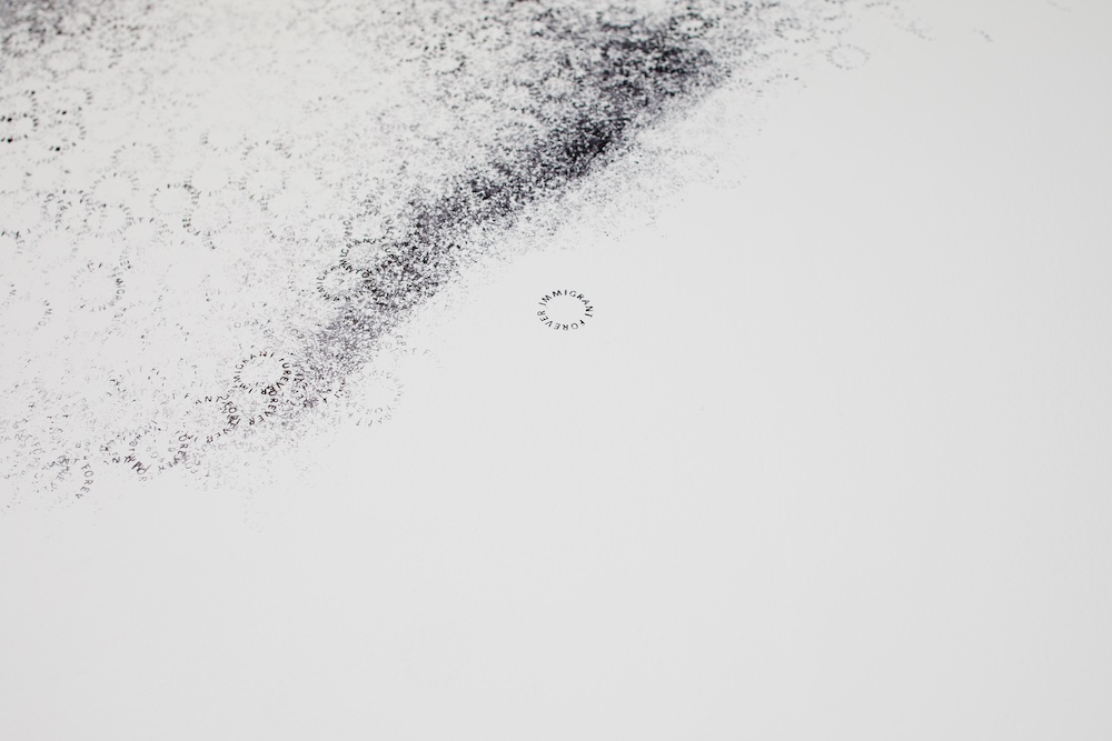 Le parcours d’exposition se divise en trois parties, axées autour de trois notions : la perspective, la frontière et l’horizon. Dans chacune d’entre elles, les œuvres présentées cherchent à s’affranchir d’une vision occidentalo-centrée du monde. Les lignes imaginaires et invisibles qui cloisonnent les êtres humains et déterminent leur identité culturelle sont repensées. L’horizon est alors vu comme un espace d’accueil, de liberté et de partage plus inclusif. L’œuvre de Marco Godinho Forever Immigrant se présente comme un nuage, volatile et sans frontières définies. À travers la répétition de l’inscription « Forever Immigrant », l’artiste pousse à questionner le statut de celles et ceux qui ont dû partir de leur territoire.