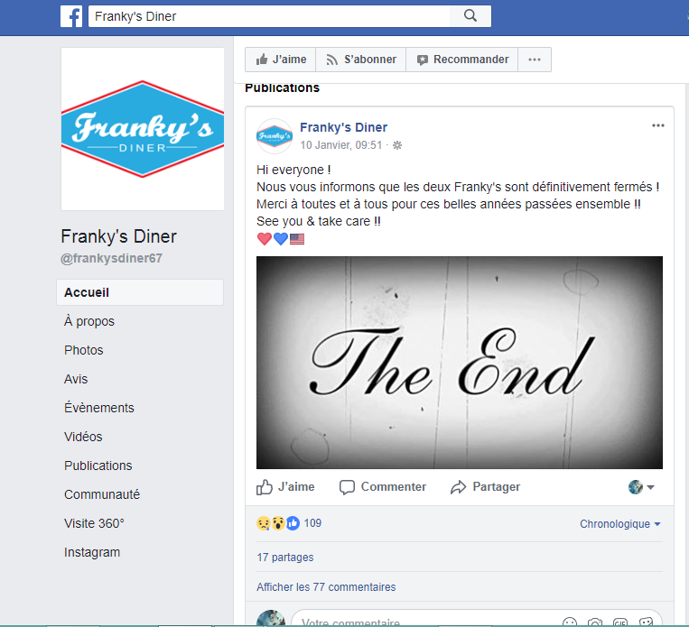 Toujours selon Franck Meunier, ce n’est pas un manque de clientèle qui aurait motivé la fermeture des deux restaurants, mais un simple « arbitrage ». Franck Meunier a cédé les fonds de commerce mais est resté propriétaire de la marque « Franky’s Diner. » Sur Facebook en tout cas, la surprise était totale parmi les habitués des restaurants :