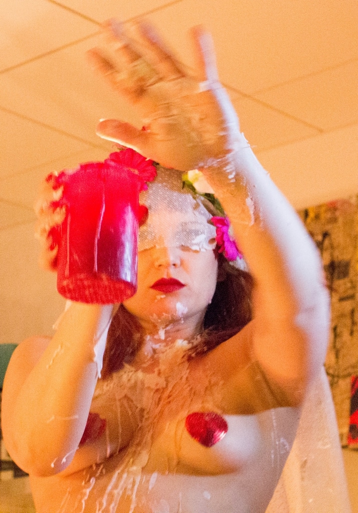 Surtout connue pour ses prestations d’effeuillage, Luna aime changer de registre. Lors d’un spectacle éclair à la Popartiserie mi-avril, la voilà dans un univers sombre, loin des classiques du burlesque. Bougies, prie-Dieu et ambiance tamisée : Luna Moka entre vêtue d’une robe blanche, un voile cache ses yeux, sa tête est ornée de fleurs.