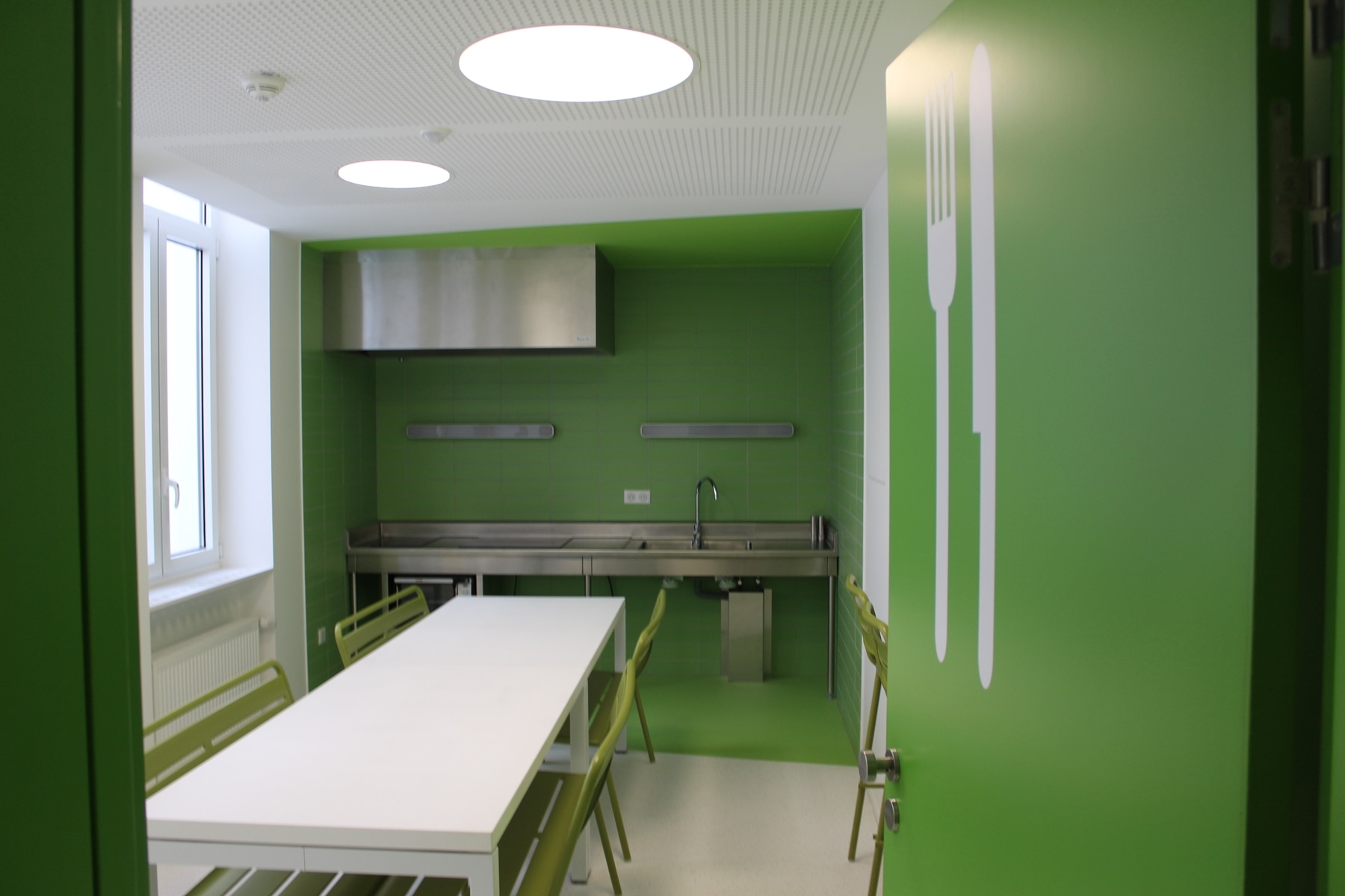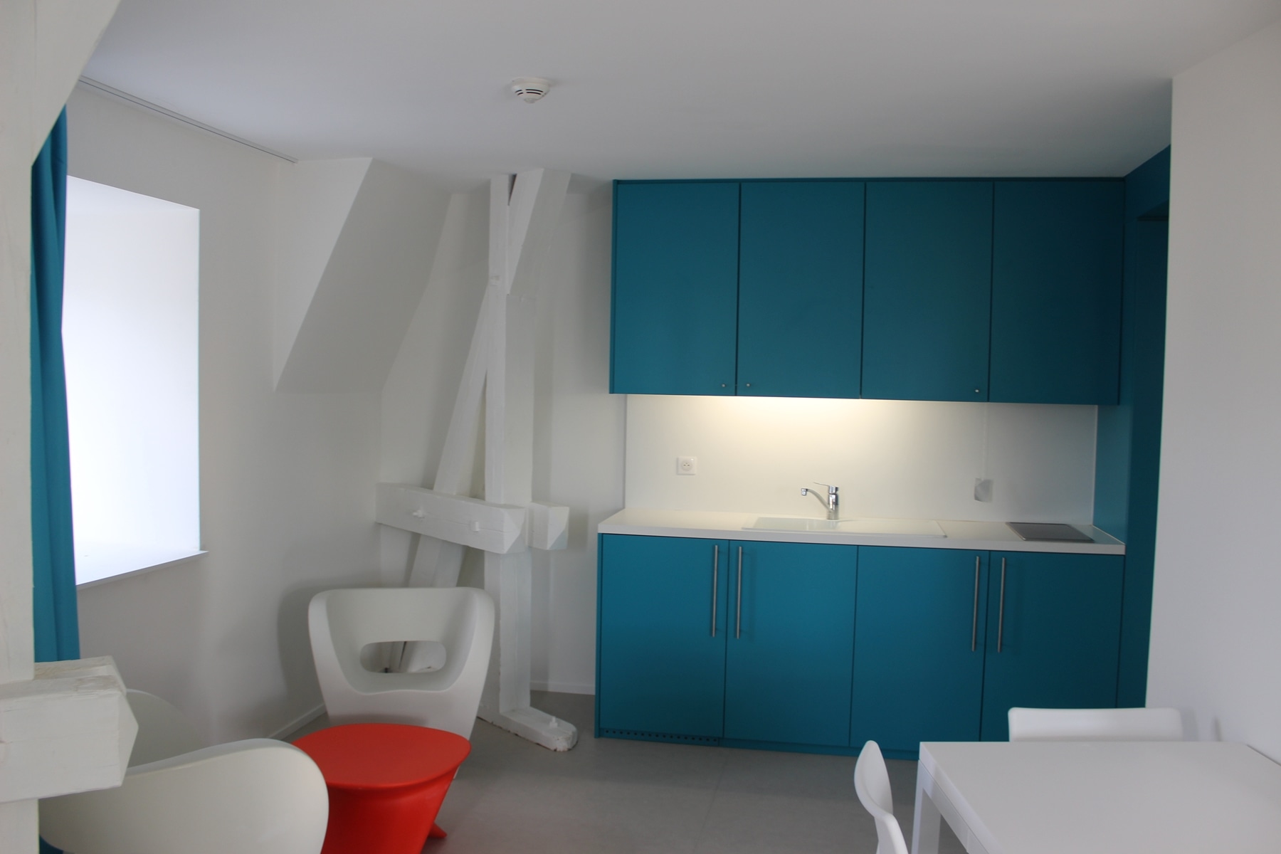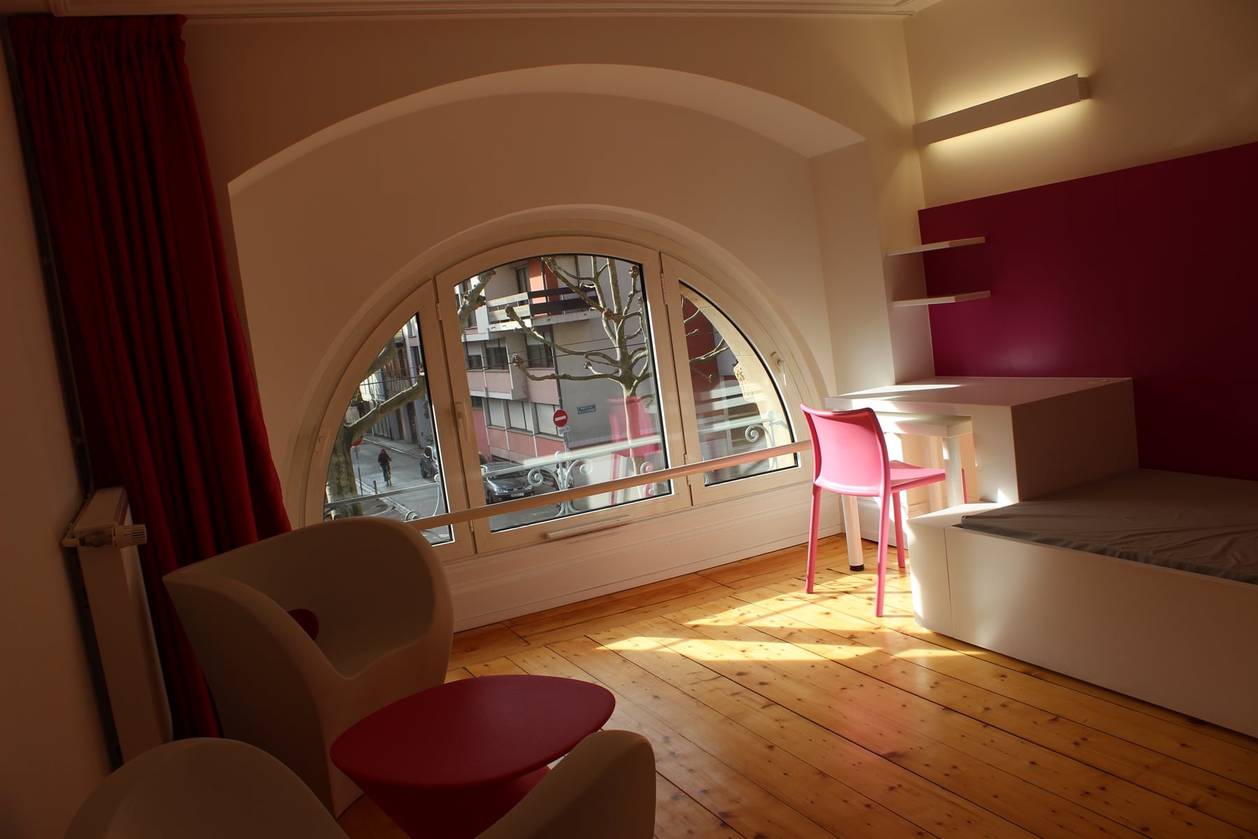 Aux chambres dédiés aux étudiants s’ajoute une offre d’une vingtaine de chambres « court séjour », au même prix sauf pour les non-étudiants (de 16,12 à 34,34 euros la nuitée). Le Crous vise cette fois les étudiants ou les enseignants chercheurs de passage à Strasbourg, dans le cadre d’échanges. Ces chambres sont situées dans l’étage de couleur fuschia, à l’entresol.