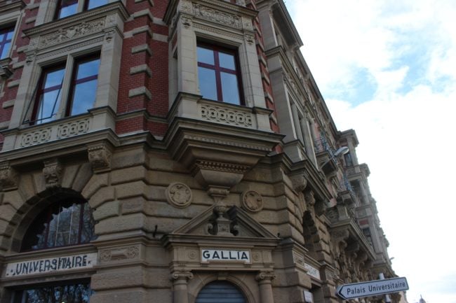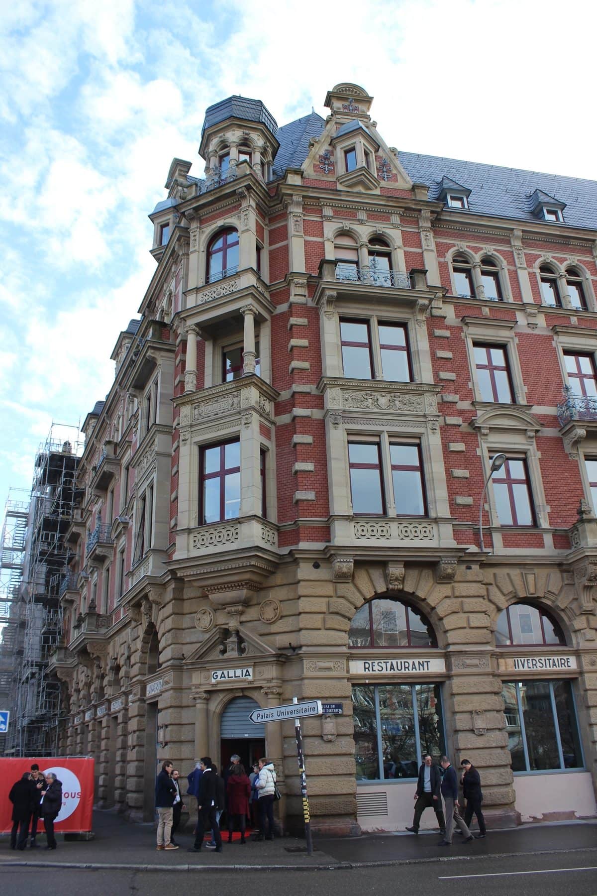 La Gallia est l’un des bâtiments phares de la Neustadt de Strasbourg. Sa façade extérieure, en pierres de taille et briques rouges, n’a pas été modifiée par les travaux de rénovation.