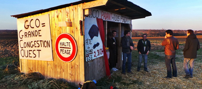 Ces constructions en bois symbolisent les futurs péages du GCO (le tarif de 3 à 5€ par passage est souvent évoqué) et doivent sensibiliser les passants. Le soir, autour du feu, les soutiens défilent. Deux maires des communes voisines, des riverains, un agriculteur… Sur la route, des voitures klaxonnent en signe d’encouragement.