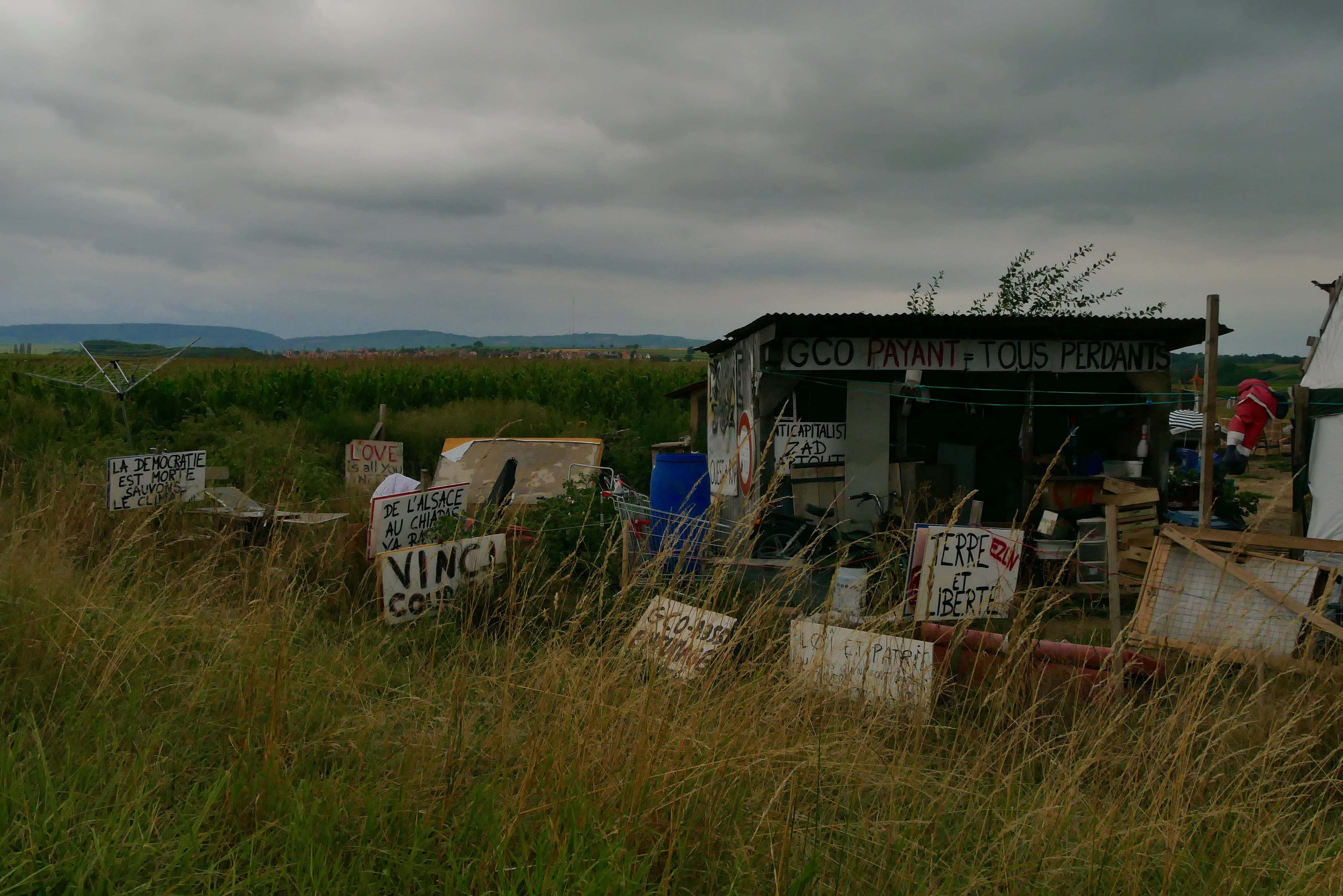 Kolbsheim fait partie des communes les plus touchées par le projet autoroutier. Photo : Guillaume Krempp / Rue89 Strasbourg / cc Quelques militants anti-GCO continuent d’occuper une petite zone à quelques pas des travaux. Photo : Guillaume Krempp / Rue89 Strasbourg / cc Les engins de chantier garés en ligne en attendant de reprendre du service le lendemain Photo : Guillaume Krempp / Rue89 Strasbourg / cc Un pont en construction près de Kolbsheim. Photo : Guillaume Krempp / Rue89 Strasbourg / cc Un autre chantier, en bordure d’Ittenheim. Photo : Emeline Burckel / Rue89 Strasbourg / cc