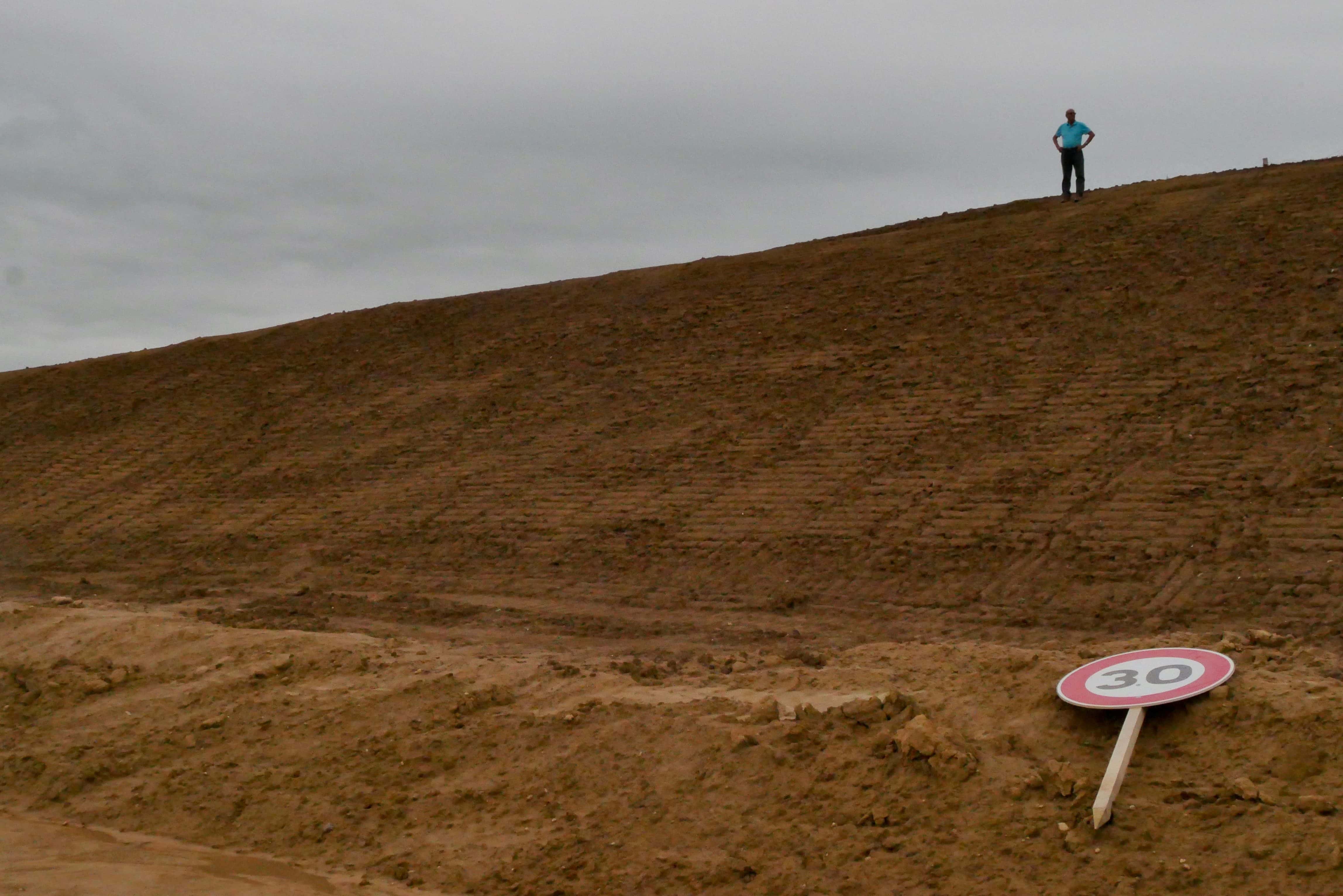 Fin juillet, un dimanche, un après-midi nuageux. Un photographe hésite devant le chantier du GCO à Kolbsheim. Des barrières et un panneau lui interdisent l’accès à l’immense étendue de terre qui éventre la forêt. Puis il se décide. Malgré ses Vans en tissu, peu adaptées au terrain boueux, il monte la butte puis se retourne.