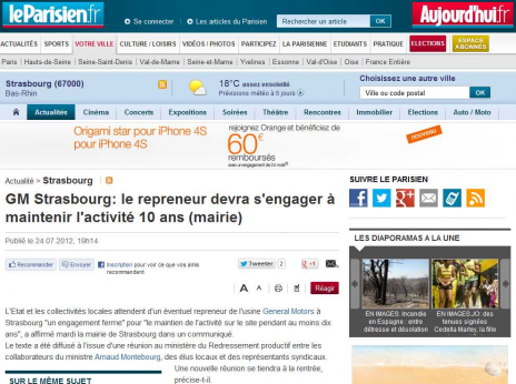 Selon le Parisien, l’éventuel repreneur de l’usine General Motors devra prendre « engagement ferme » sur le « maintien de l’activité sur le site pendant au moins dix ans ». La nouvelle est tombée mardi à l’issue d’une réunion entre des élus locaux, des représentants syndicaux et le ministre de redressement productif Arnaud Montebourg dans un contexte d’inquiétude grandissante autour de l’avenir de l’usine bas-rhinoise.
