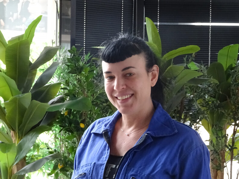 Sur le chantier du festival, elle se présente en blouse bleue de travail, affublée d’un t-shirt floqué « Alsace Airlines ». Coralie, 41 ans, dirige avec ardeur le montage des scènes, installe les affiches et donne les dernières directives… Dans quelques jours, elle troquera ses vêtements de bricoleuse pour une jupe virevoltante et les talons hauts de son personnage Coco Das Vegas. Icône féministe et sex-symbol dans une société patriarcale, le concept des pin-ups fait face à ses propres contradictions.
