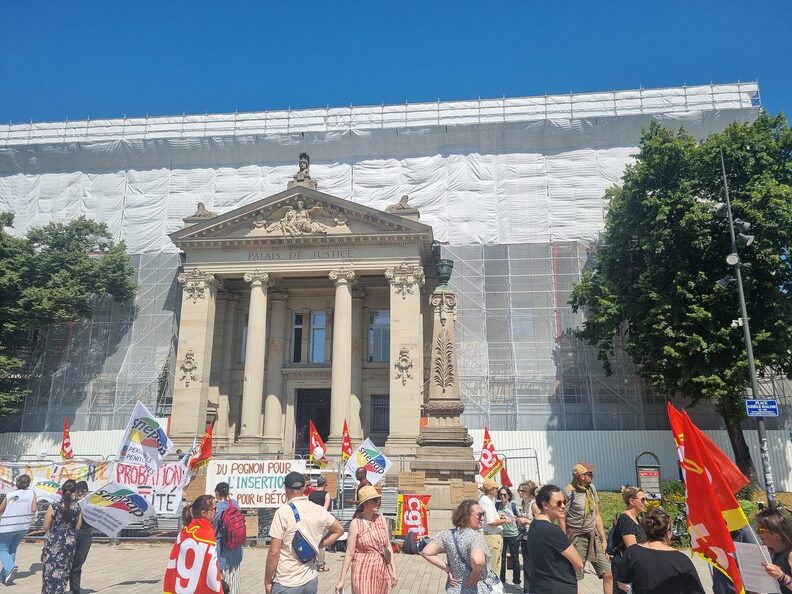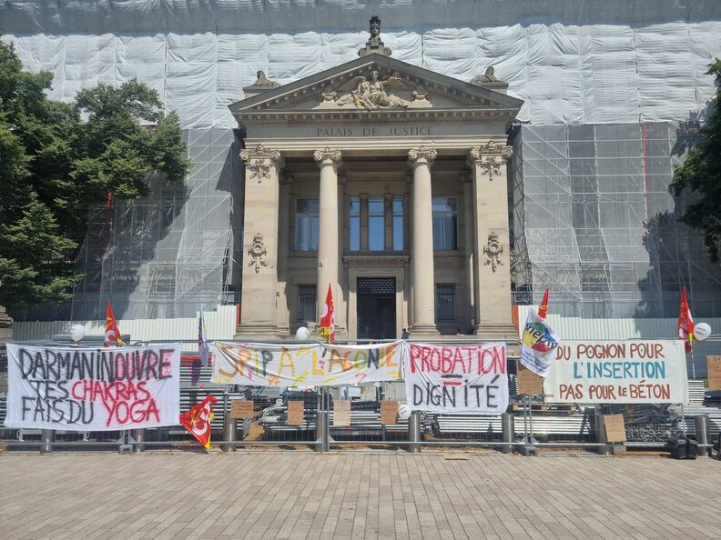 À l’appel des syndicats CGT et SNEPAP-FSU, près d’une quarantaine de travailleurs des services pénitentiaires d’insertion et de probation (SPIP) de la région Grand Est ont manifesté, mardi 17 juin, devant le tribunal judiciaire de Strasbourg. N’ayant pas le droit de grève, ils ont posé un congé pour défendre leur mission de réinsertion contre les déclarations du ministre de la Justice Gérald Darmanin qui traduisent, à leurs yeux, une « dérive punitive ».