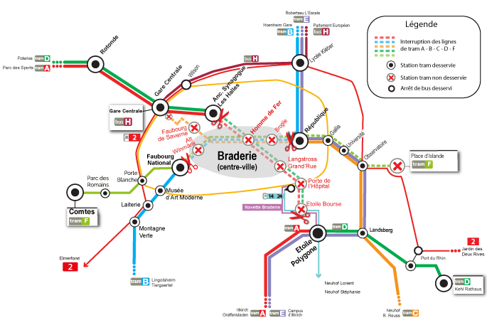 Comme chaque année, le centre-ville ne sera pas desservi en transports en commun samedi 22 juillet jusqu’à 22h30. Certaines lignes de bus seront déviées de leurs itinéraires au centre-ville dès le vendredi 21 juillet à partir de 22h. En outre, les transports en commun ne seront pas gratuits ce jour-là, comme cela avait pu être le cas en 2022. De plus, les parkings Gutenberg, Kléber et Broglie seront fermés à partir de 4h30 le samedi 22 juillet et jusqu’à 1h le dimanche 23 juillet.