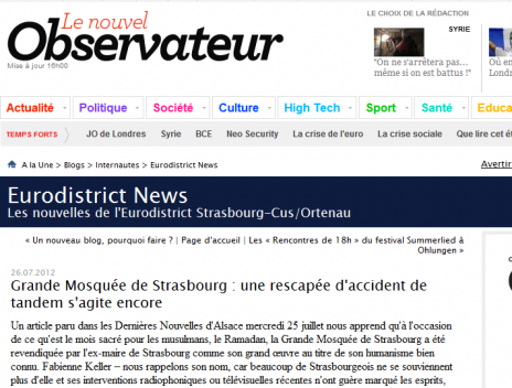 Christophe Panzer rafraîchit la mémoire de Fabienne Keller, ex-maire de Strasbourg, sur son blog Eurodistrict News, hébergé sur le site du Nouvel Observateur. Dans un article sur le ramadan paru fin juillet, Fabienne Keller aurait décrit la Grande Mosquée de Strasbourg « comme son grand œuvre au titre de son humanisme bien connu » débute le blogueur, pour qui l’attachement de l’ex-maire de Strasbourg, et de son binôme municipal Robert Grossmann, au respect des droits de la communauté musulmane date des municipales de 2008, « quand ils se sont appercus que les musulmans votaient aussi ». Avant cela, le dialogue était beaucoup moins fluide, rappelle le blogueur.