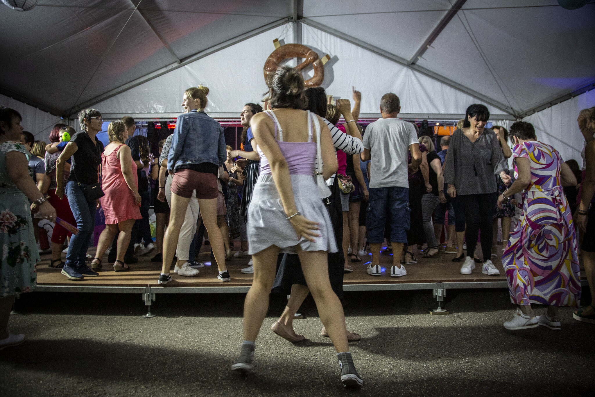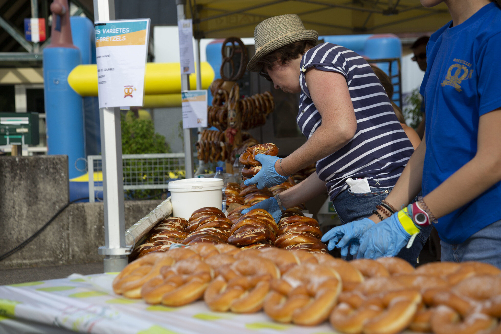 Au stand de bretzels près de l’école, ils sont d’ailleurs trois jeunes adolescents bénévoles à s’activer avec enthousiasme, plus rapides que leurs aînés lorsqu’il s’agit de tendre aux visiteurs leurs petits nœuds briochés dans une serviette en papier. Il est 19h et la file d’attente pour acheter les tickets boissons et nourriture s’allonge jusqu’à l’entrée de la place.
