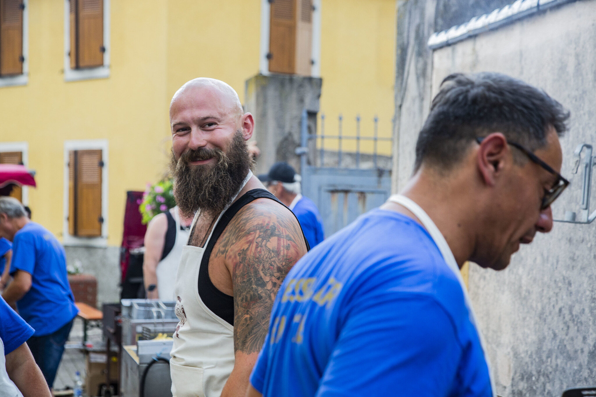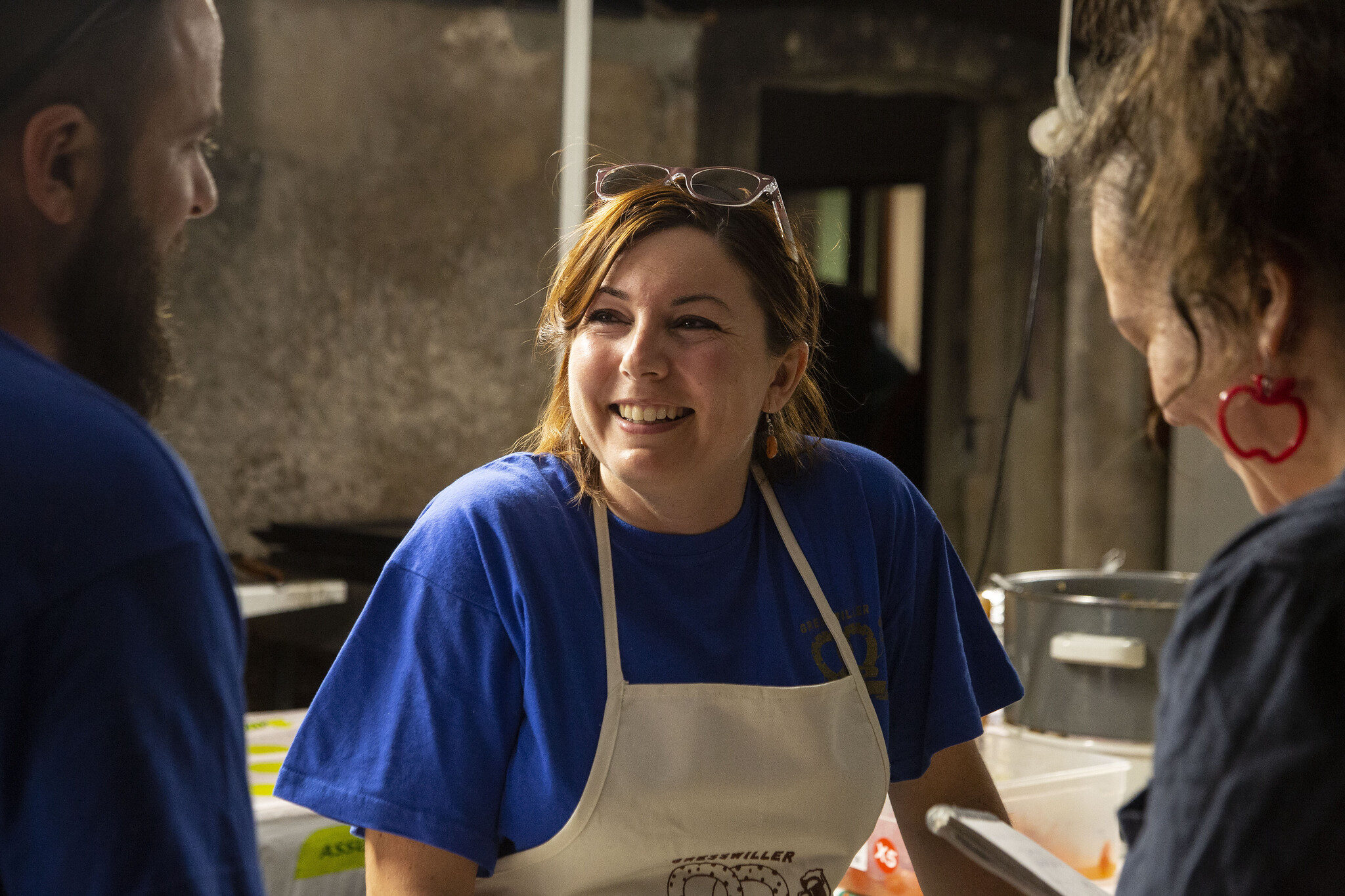 En cuisine, les bénévoles mettent les bouchées doubles pour servir tout le monde. Ce qui n’empêche pas le maître du grill et celui des grillades de s’apostropher pour savoir qui travaille le plus, le mieux, et le plus rapidement. Grand gaillard de 33 ans, Yannick, dit Yax, brandit sa spatule en direction d’Arnaud Chabal en riant.