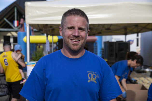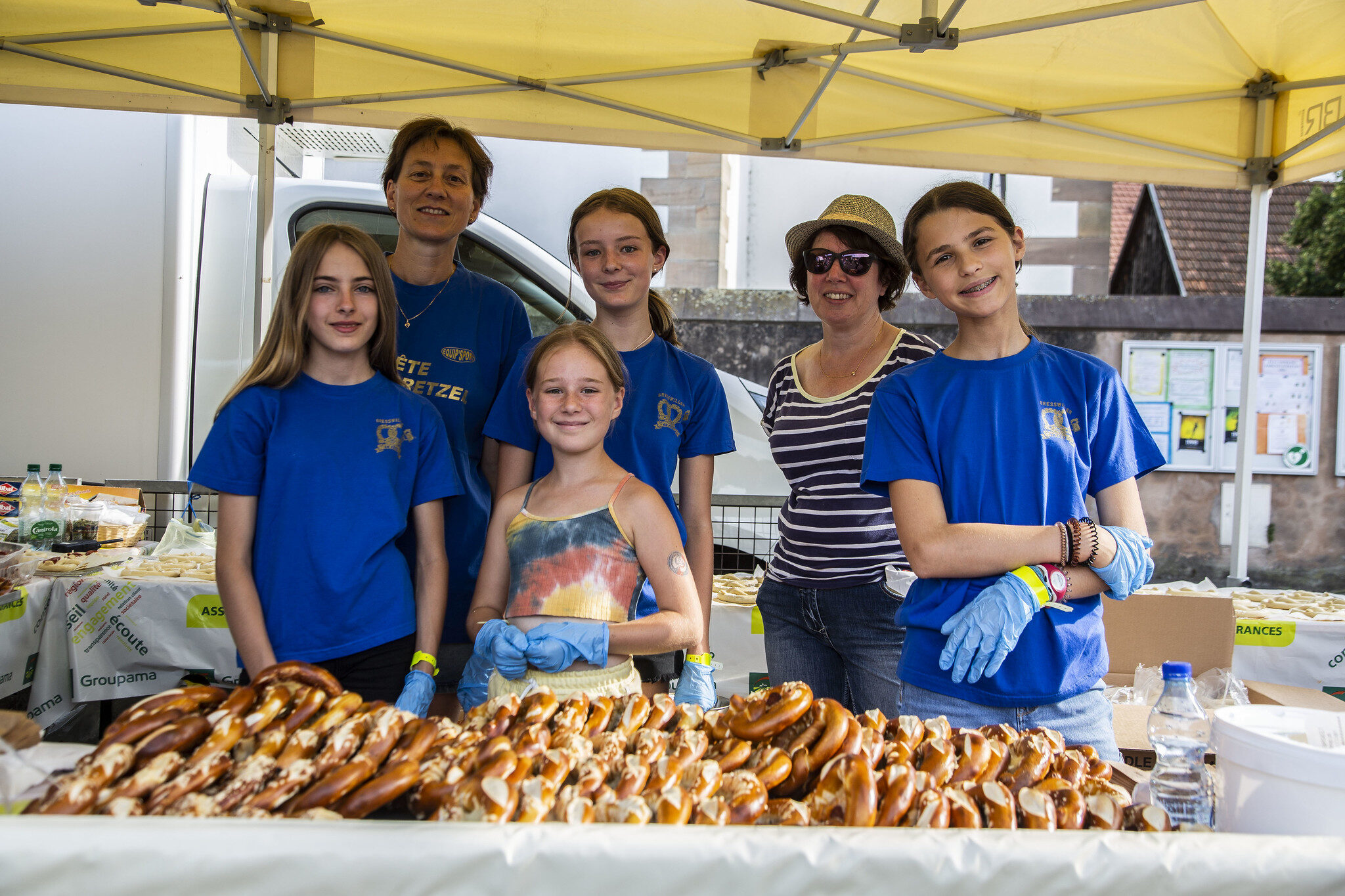 À une heure du début des festivités de ce samedi 25 juin, tout est presque prêt. Les premiers visiteurs ont déjà leur verre de bière à la main et les bretzels s’amoncellent sur les stands. Mais pendant que certains hésitent entre une version sucrée, salée, ou gratinée, les bénévoles de Gresswiller en fête courent dans tous les sens avec leurs t-shirts bleus pour régler les derniers préparatifs. Talkie-walkie à la ceinture, Julien Muller fait partie des plus sollicités.