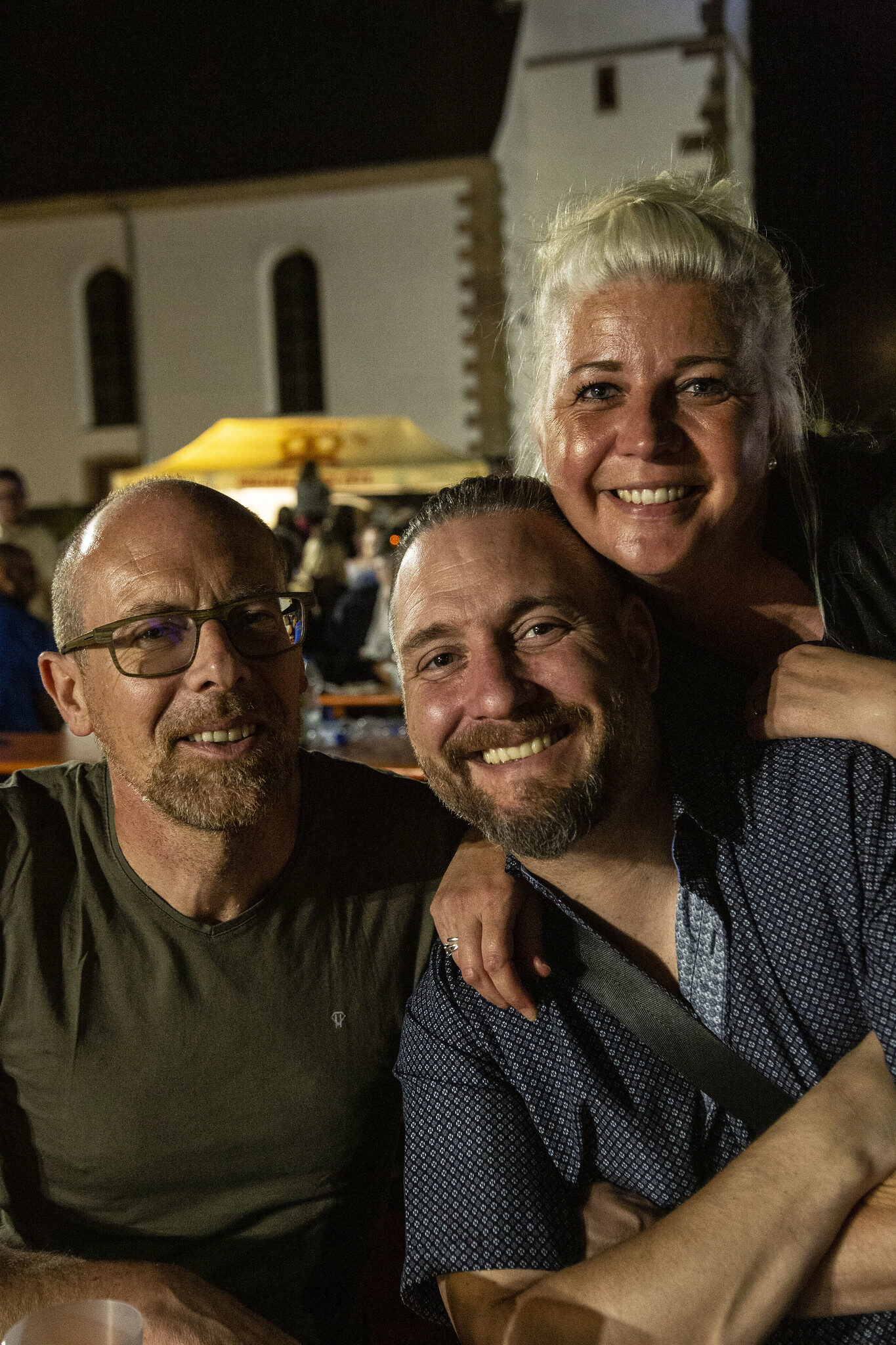 De l’autre côté de la place, Ces années là retentit sur la scène. Le volume de la musique a pris quelques décibels et le parquet de danse est désormais si bien rempli que certains se trémoussent devant. Suivent Tal et le célèbre Envole-moi de Jean-Jacques Goldman. Un peu à l’écart, à mi-chemin entre le stand des bretzels et celui des bières mais « loin des épouses », trois amis de longue date discutent autour d’un verre. Laurent, Joël Burger et Didier Hochwenker étaient à l’école ensemble et ont toujours vécu à Gresswiller.