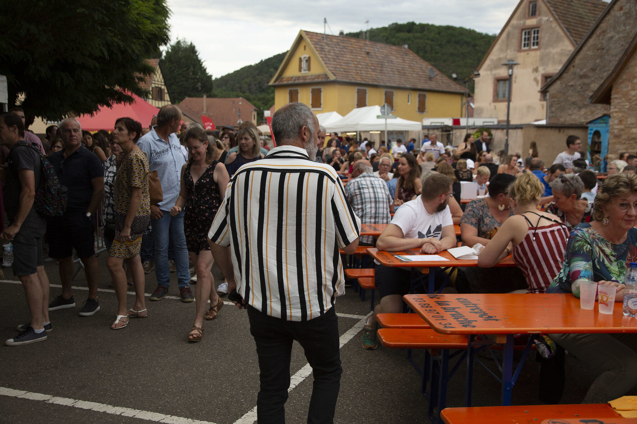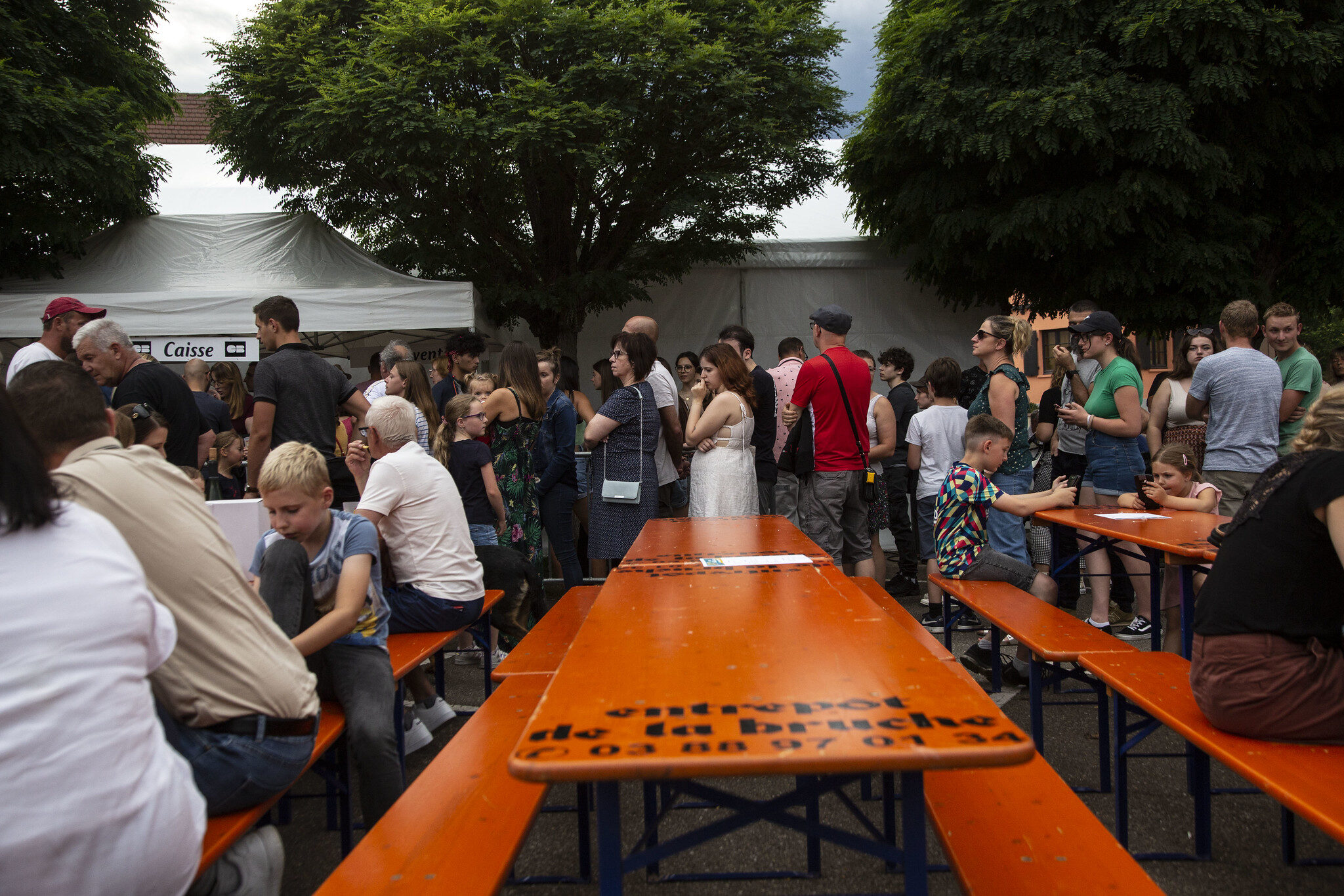 L’odeur du pain tout juste sorti du four flotte sur la place centrale de Gresswiller. Dix-huit heures sonnent au clocher de ce village de la vallée de la Bruche, à une demi-heure de route de Strasbourg. Entre l’église, la mairie et les maisons à colombages de la rue principale, une tonnelle et un parquet de danse ont été dressés. Les musiciens font leurs balances en jouant du Clara Luciani sur fond de cris d’enfants heureux de sauter dans les structures gonflables installées dans la cour de l’école.