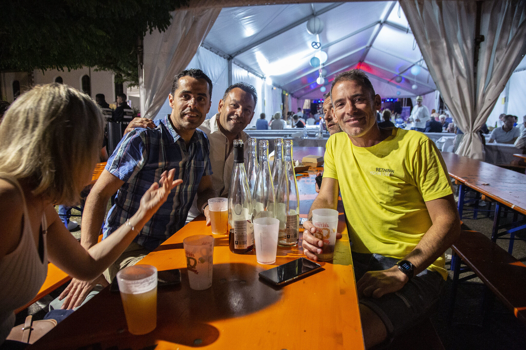 22h45. Les rires se font entendre un peu plus fort sur la place. Moins de convives, mais plus de bouteilles vides sur les tables. Guillaume Bernhard est en pleine discussion, derrière la tonnelle. « Je n’ai jamais vu autant de monde que cette année, s’étonne le quadragénaire de Mutzig. Je dirais qu’il y a une fois et demi ce qu’il y avait avant le covid ». L’ambiance ? « Magique ! Tout le monde revit ! » « Ça fait du bien de sortir de chez soi, de voir des gens », abonde David Fluck.