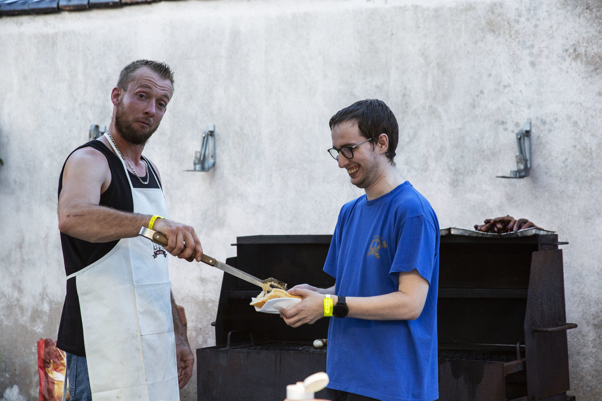 Une heure plus tard, tandis que certains profitent de ce que le coup de feu soit passé pour diner à leur tour, les deux hommes se taquinent toujours. « Y a pas une seule tâche sur ton tablier ! » « Mais c’est parce que nous on sait travailler proprement ! » Yax estime avoir servi près de mille burgers pendant la soirée pour un nombre de visiteurs évalués aux alentours de 1 500. Un record. S’il donne un coup de main, c’est en raison de la convivialité de l’événement. « Ça fait bouger le village. Vous avez vu l’ambiance un peu ? »