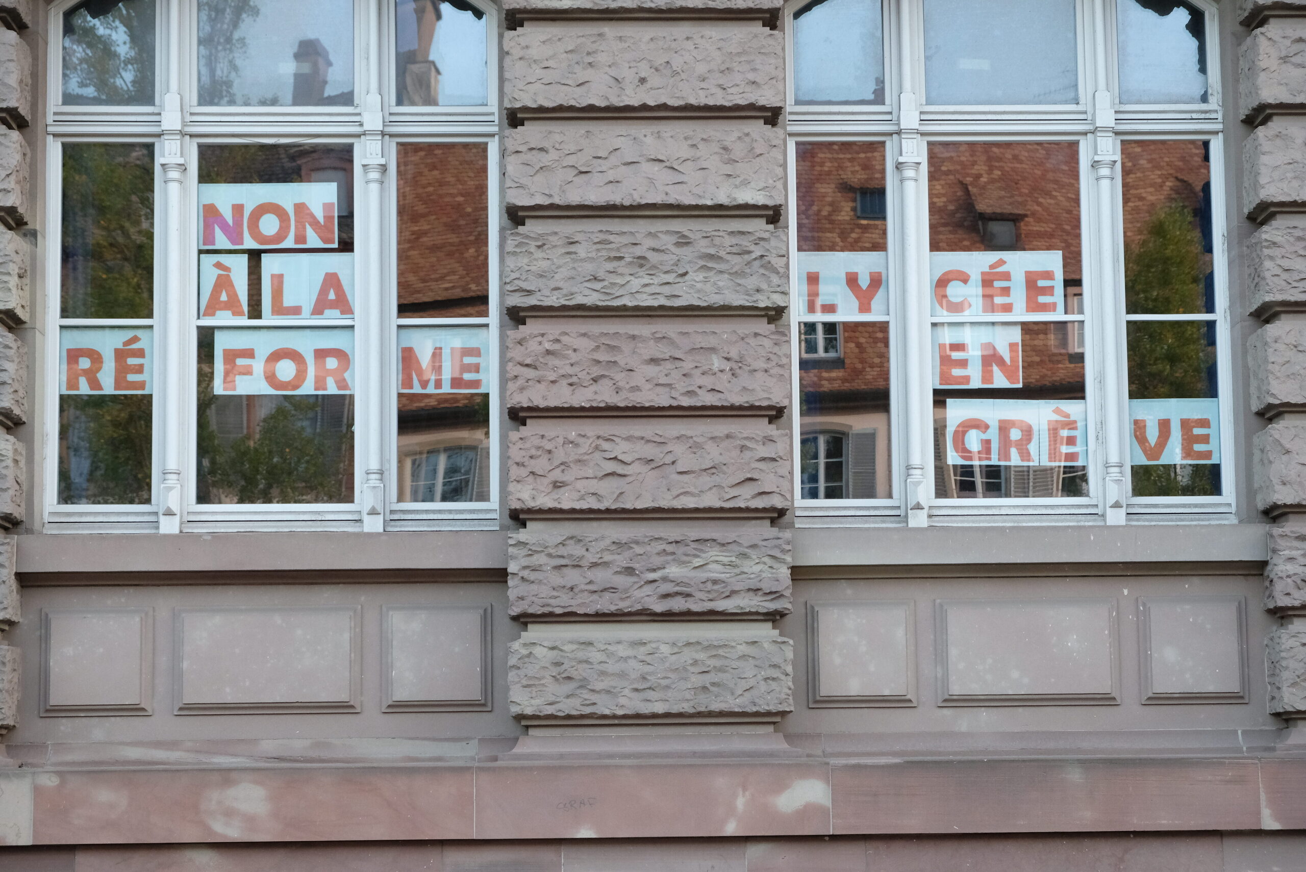 Lundi 17 octobre à 17 heures, veille de grève au lycée professionnel René Cassin, rue du Dragon à Strasbourg. La salle des profs bruisse d’une agitation inhabituelle. Des lettres en capitales sortent de l’imprimante pour être bientôt scotchées aux fenêtres : « Non à la réforme – Lycée pro en grève ».