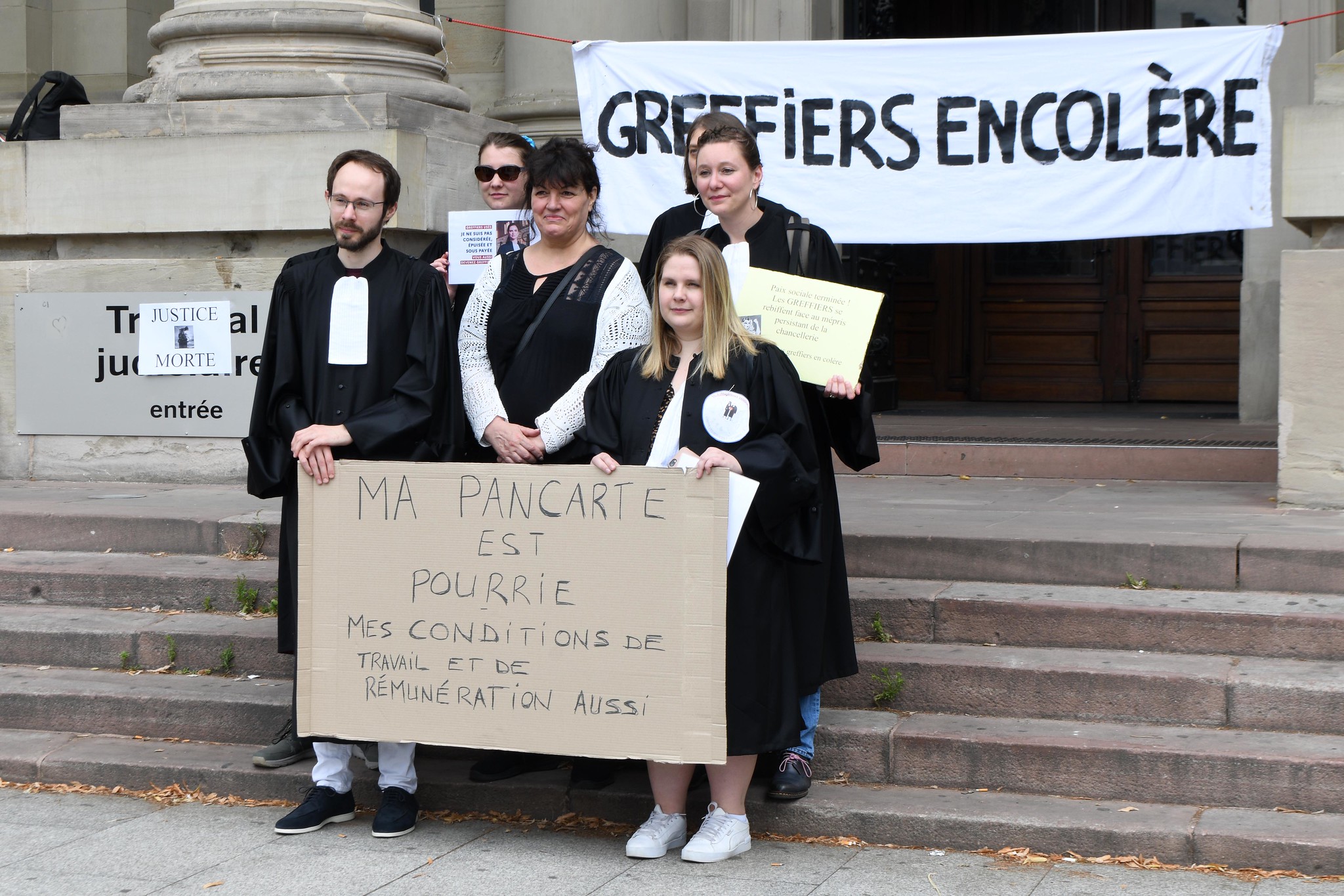 La mobilisation est nationale, et la lassitude générale. En cette matinée du lundi 3 juillet, sur le parvis du tribunal judiciaire de Strasbourg, une porte-parole décompte environ 80% de grévistes au sein des fonctionnaires de greffe du tribunal judiciaire.