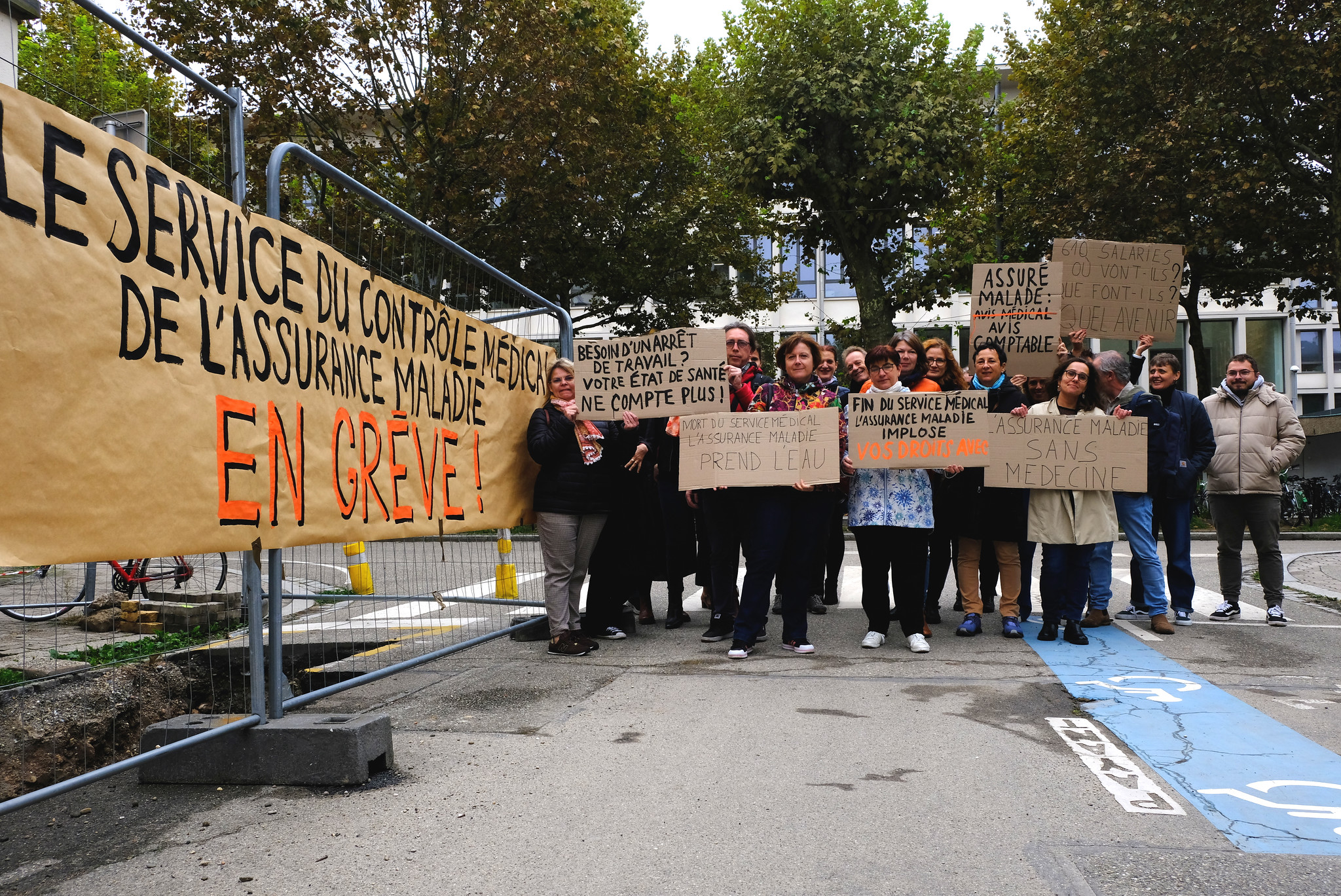 « Besoin d’un arrêt de travail ? Votre santé ne compte plus ! » Il y a parfois des pancartes qui résument bien l’enjeu d’une manifestation. C’est le cas de ce carton accroché sur un grillage de chantier au 22 rue de l’Université à Strasbourg dans la matinée du jeudi 3 octobre. À côté, une trentaine d’agents du service médical de l’Assurance maladie sont en grève. Ils manifestent contre une fusion à venir de leur service au sein de la Caisse primaire d’assurance-maladie (CPAM). Pharmacien-conseil et délégué régional CFE-CGC, Philippe Perearnau résume le « danger pour les assurés » :