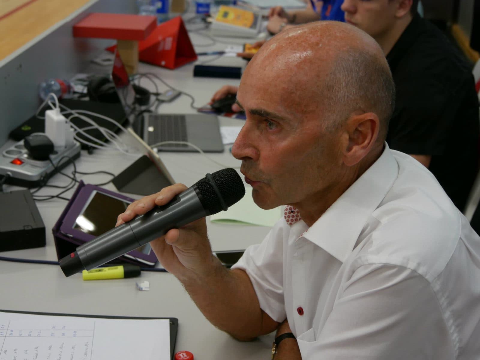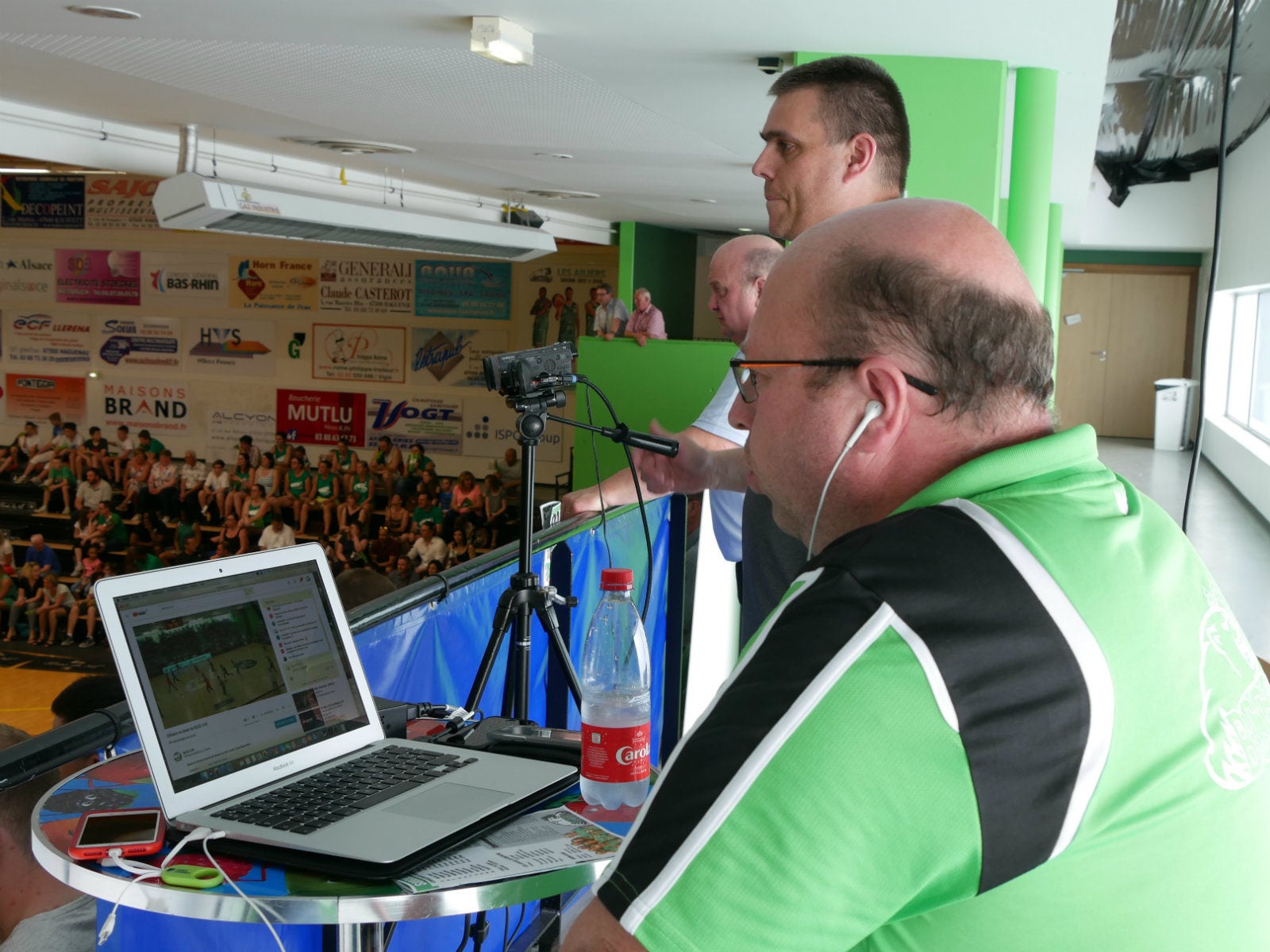 Le speaker du club de Gries commente le match et incite le public à encourager son équipe.