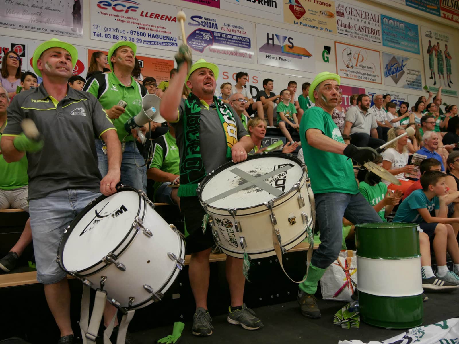 Ecouter : Les quinze membres du club de supporters donnent de la voix : « Allez les verts, les verts et blancs! »
