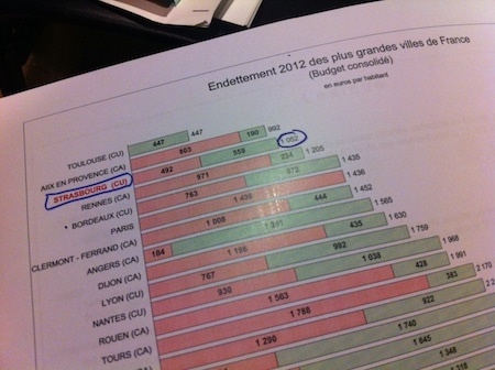 Alain Fontanel fait photocopier pour la presse un document qui compare l’endettement de Strasbourg et des autres grandes villes de France… Strasbourg y apparait très à son avantage avec environ 1000€ par habitant contre plus de 3000 pour Marseille, dernière de la classe.