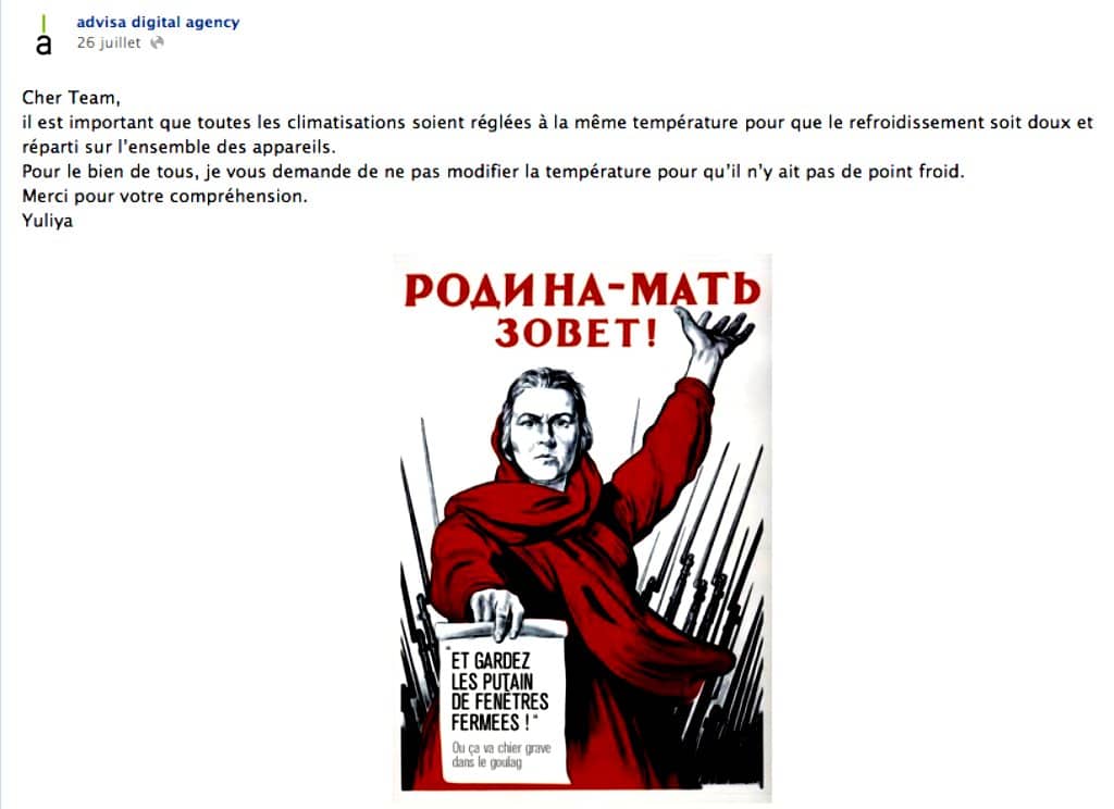 Dans cette agence strasbourgeoise, on a visiblement décidé de traiter la question avec humour. La preuve en est, un message sur la page Facebook de l’agence par Yuliya qui invite les employés d’Advisa à ne pas changer la température des appareils de climatisation, ainsi qu’une illustration qui dissuade pas mal d’ouvrir les fenêtres.