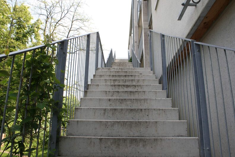 L’escalier extérieur pose parfois quelques soucis : certains voisins voient passer beaucoup de monde devant leur fenêtre à longueur de journée. (LJ / Rue89 Strasbourg)Photo : LJ / Rue89 Strasbourg
