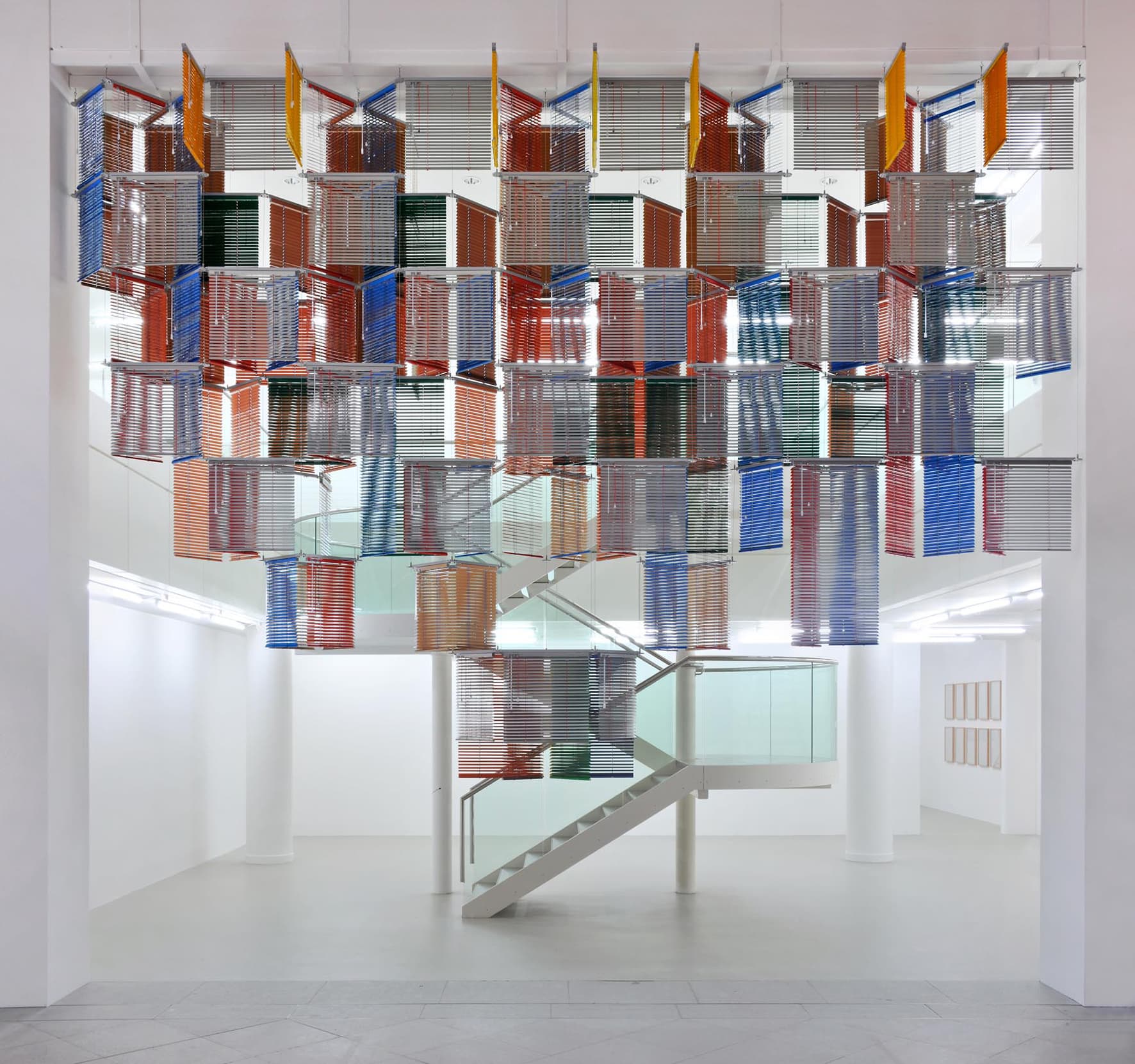 Au musée d’Art moderne et contemporain de Strasbourg, c’est un éclairage au néon froid qui nous accueille. La première installation sert à la fois à ouvrir et fermer l’espace, il s’agit de Blind Curtain – Flesh behind Tricolore. Sorte de moucharabieh moderne, le store vénitien est l’un des matériaux qui revient régulièrement dans l’œuvre d’Haegue Yang. Ici, il s’agit d’un ensemble de stores répartis en carrés qui dessinent et masquent l’espace dans lequel nous allons pénétrer. Au Mamcs, nous sommes face à un éclatement des propositions plastiques de l’artiste, on y trouve des installations, des photographies, des photo-montages, des cadavres-exquis, des sons et des sculptures qui dénotent de la richesse de son imagination.