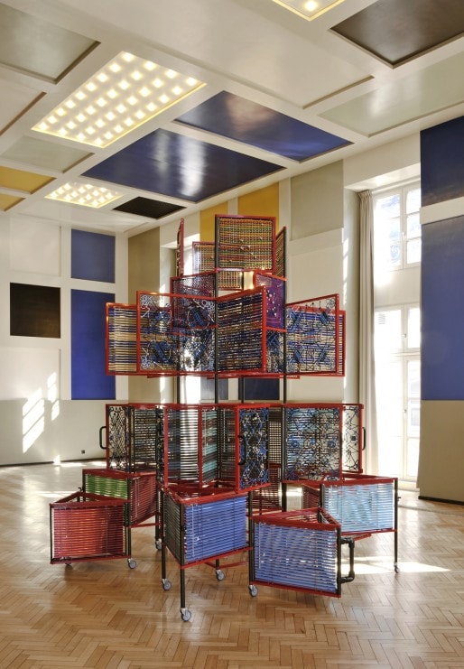 Chaque pièce réalisée par Haegue Yang a été choisie par l’artiste pour créer un écho avec les différents espaces. Dans la salle des fêtes, par exemple, se trouvent deux Dress Vehicles : Zig-Zag et Yin Yang. Il s’agit de grandes sculptures montées sur roues, ces deux œuvres sont constituées d’éléments métalliques, de stores vénitiens (que l’on retrouve ici comme au Mamcs), de macramé et de clochettes. « M’accorderiez-vous cette danse ? », nous disent-elles. Il nous est possible d’y entrer (dans la danse mais surtout dans les œuvres) et, grâce à des poignées, on peut les bouger et tournoyer dans cette salle des fêtes. Haegue Yang rend hommage au mouvement dada et aux murs qui l’accueillent tout en se les réappropriant : les éléments parallélépipédiques et les couleurs qu’elle y associe répondent aux aplats de couleur carrés de l’espace.