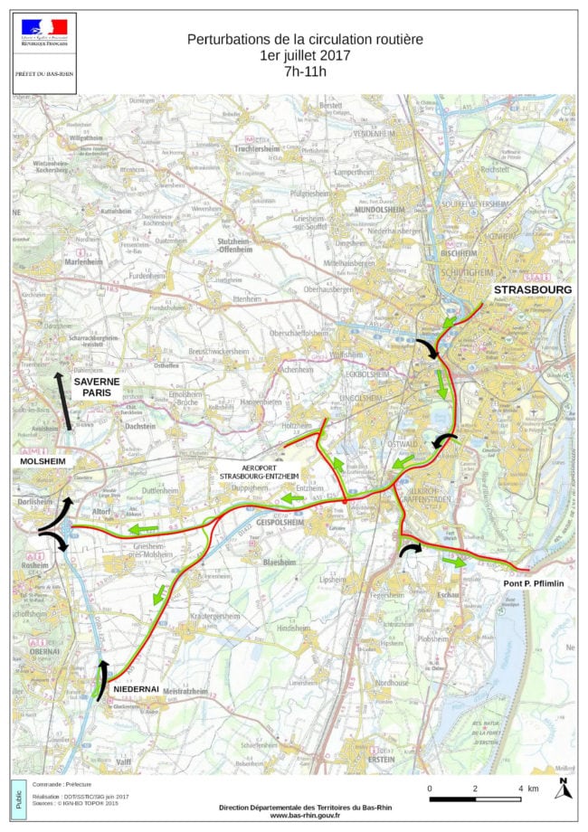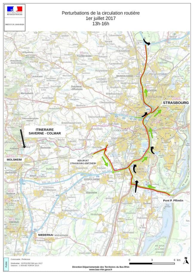 Le matin, l’autoroute A35 sera bloquée dans le sens aéroport-Parlement européen à partir de 7h, jusqu’à que la quarantaine de convois attendus soient passés, au plus tard à 11h.