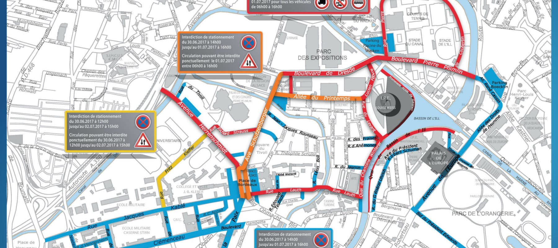 Comme le montre la carte ci-dessus, les mesures de sécurité auront un impact de vendredi 30 juin 12h pour le stationnement (rue Fritz Kiefer), jusqu’à 16h le samedi. Le stationnement sera interdit dans plusieurs rues du Wacken, des Contades, du Tivoli et de l’Orangerie (en bleu sur la carte), la plupart à partir de 14h.
