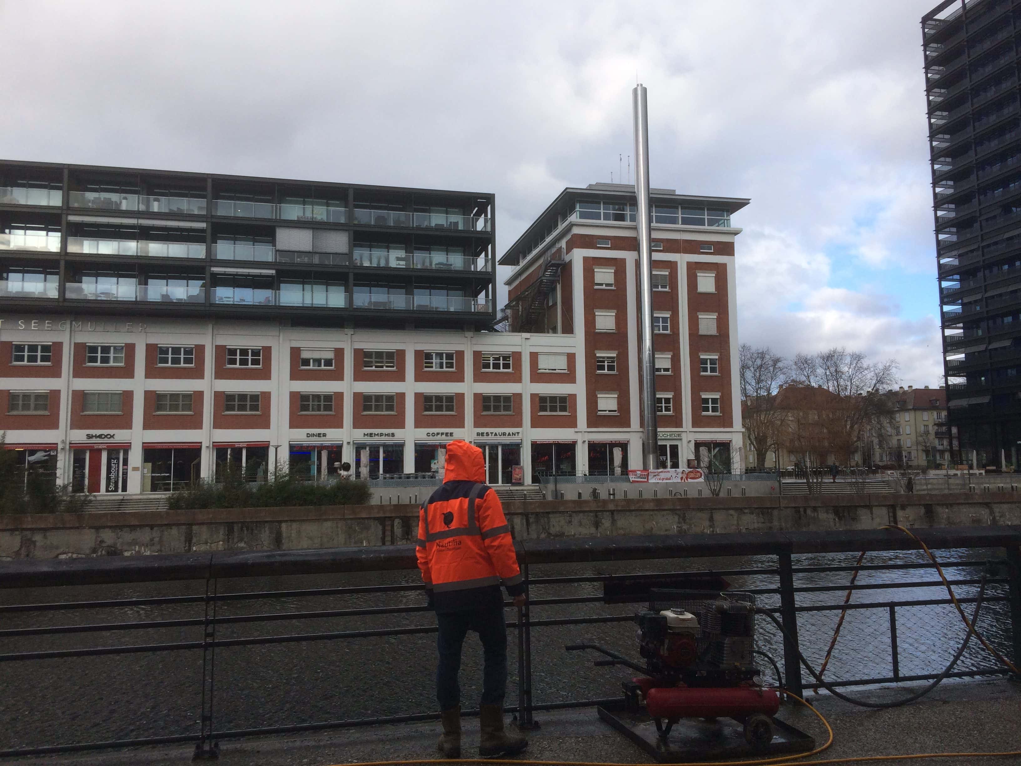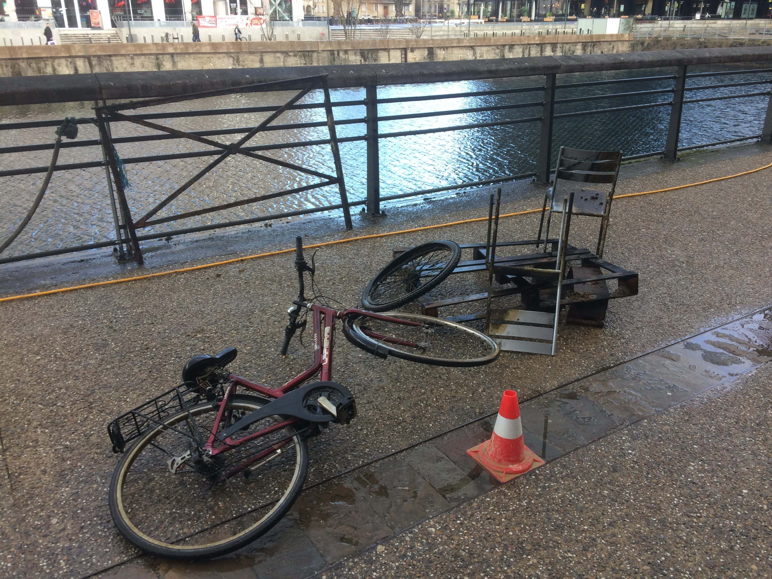 En 2017, Rue89 Strasbourg vous parlait de Sergueï, qui repêchait des vélos au fond du bassin d’Austerlitz. Ce lundi 11 février ce sont d’autres bienfaiteurs qui s’occupaient des eaux froides du jeune quartier Malraux. Aux pieds des tours Black Swans et du cinéma UGC Ciné Cité, trois collaborateurs de la société Nautilia mandatée par la Ville de Strasbourg s’affairaient. L’un d’eux en tenue de plongée explorait ces fonds aquatiques d’une profondeur de 2 à 3 mètres à l’aide d’une lampe frontale. Un autre remontait les objets à la surface à l’aide d’une corde. Le dernier délimitait un périmètre de sécurité et chargeait une camionnette avec la collecte.