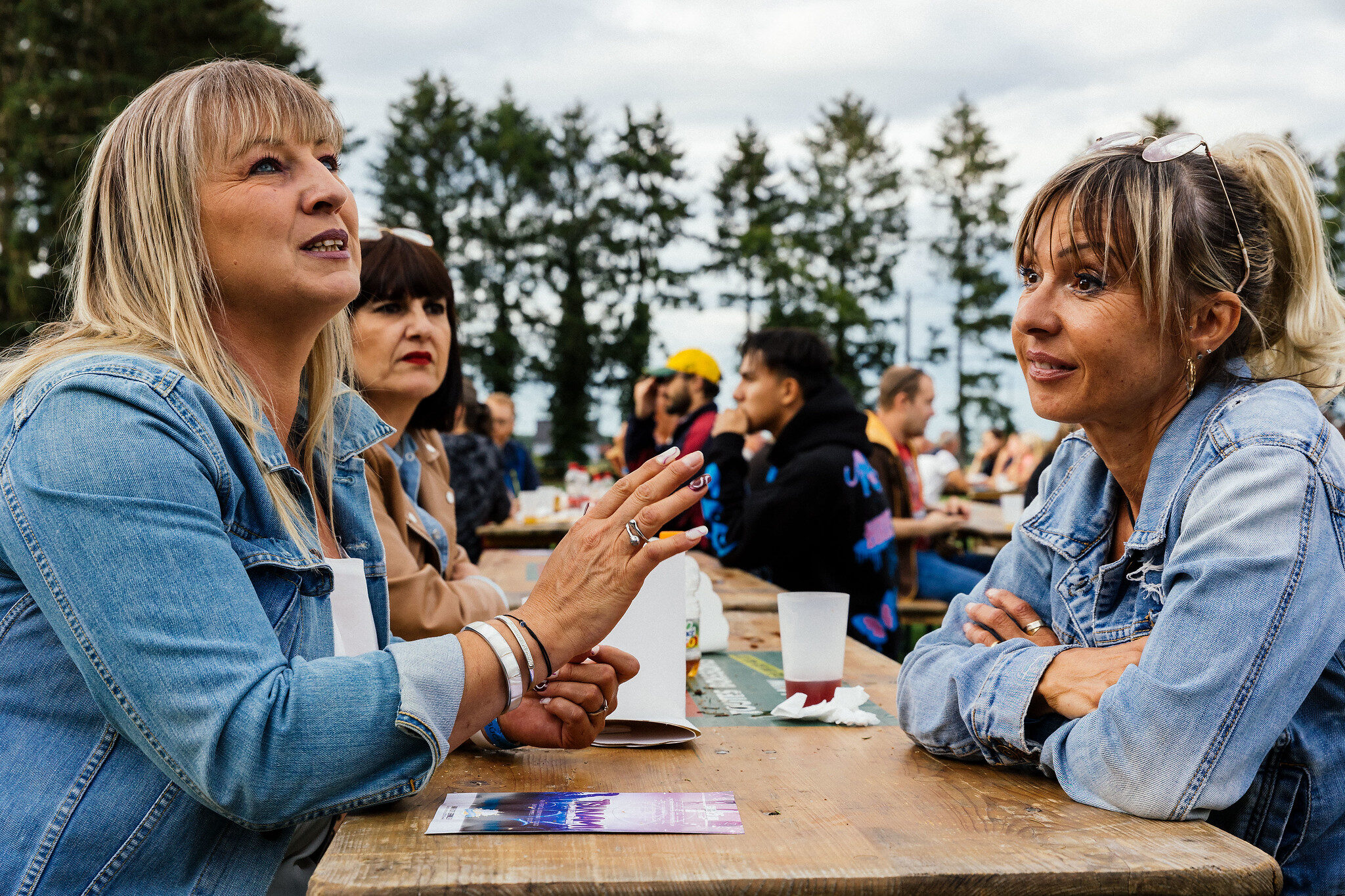 Tony et Monique, 75 ans, font partie des premiers participants à passer la grille. « On a nos habitudes » explique le mari, une canne à la main. Ce soir-là, il s’agit de commencer avec un crémant « dans un gobelet en carton », ce qui ne satisfait pas complètement l’ancien routier qui avale également quelques frites. « Dans le temps on dansait, mais c’était une autre musique », complète Monique, sandwich à la main.