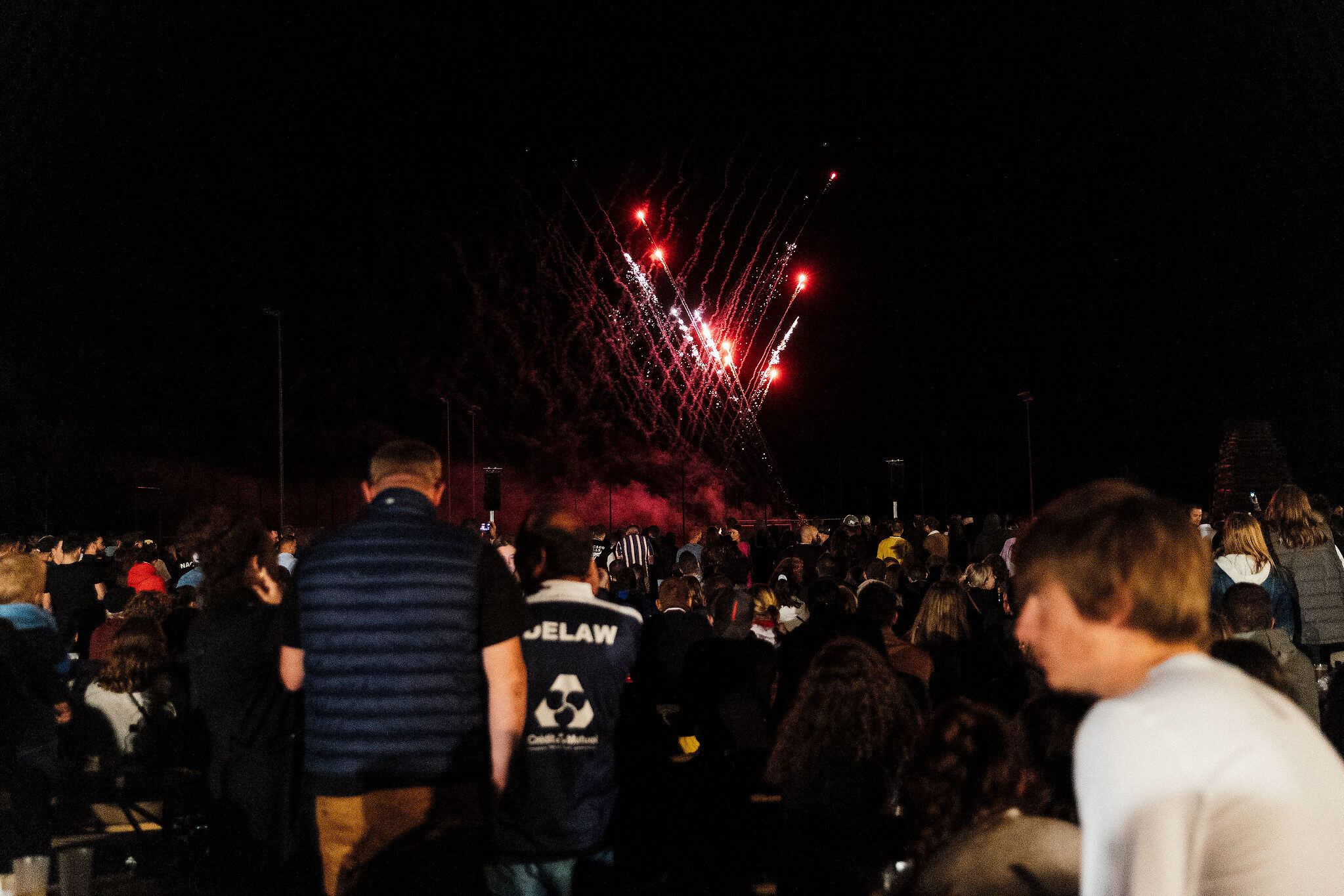 À 23h45, le feu d’artifice démarre enfin. C’est au tour des deux buchers de s’embraser. « Ça nous a pris 4 / 5 soirées avec un gars bûcheron du club », précise Joseph. Les flammes mettent quelques minutes à atteindre le sommet, et diffuser un peu de chaleur. Il éclaire le stade et la foule, happée par cette vision.