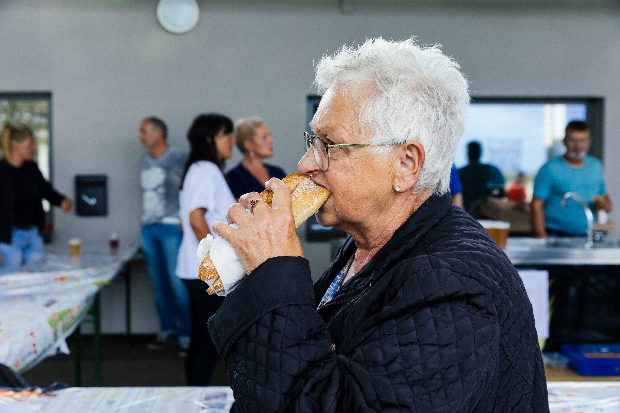 Il discute avec Bruno, une figure du club. « Ici c’est le bonheur » dit le retraité qui vient « quatre jours par semaine ». Seule inquiétude pour Bruno, la réaction des jeunes qui n’ont pas connu de fête d’ampleur pendant deux ans, pour cause de Covid. D’ailleurs, la Humpafascht dispose d’un imposant dispositif de sécurité avec une quinzaine d’agents de sécurité en coupe vent jaune fluo. Un mauvais souvenir est dans les mémoires : en 2007, une personne exclue de la soirée avait foncé avec son véhicule dans la foule causant un mort et 16 blessés. Tous les ans se tient un match à la mémoire du joueur de 21 ans décédé.