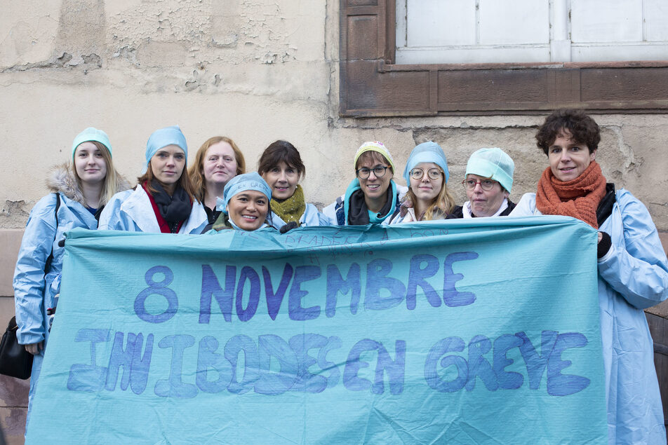 Devant la préfecture du Bas-Rhin, où la manifestation a pris fin, les infirmières de bloc comptent les collègues perdues les deux dernières années : deux départs à la retraite, cinq soignantes qui ont rejoint le privé, une autre qui a préféré l’intérim, deux cadres reclassées et d’autres parties en formation… « Le problème, c’est que personne n’est arrivé entretemps », souffle une collègue de Monique, Barbara et Myriam.