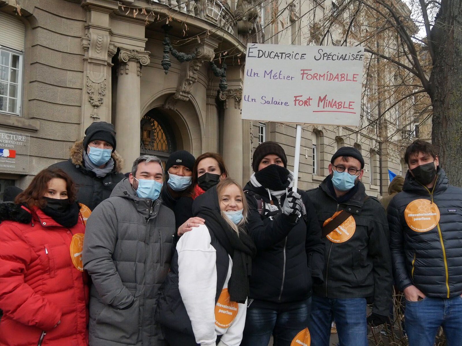 « Ségur imposture », chantent en chœur les manifestants réunis en arc de cercle devant l’entrée de la préfecture, place de la République, à Strasbourg. Plus de 1 000 personnes étaient présentes ce mardi 30 novembre, principalement des employés du secteur médico-social, pour interpeller l’État et l’opinion publique concernant leur situation.